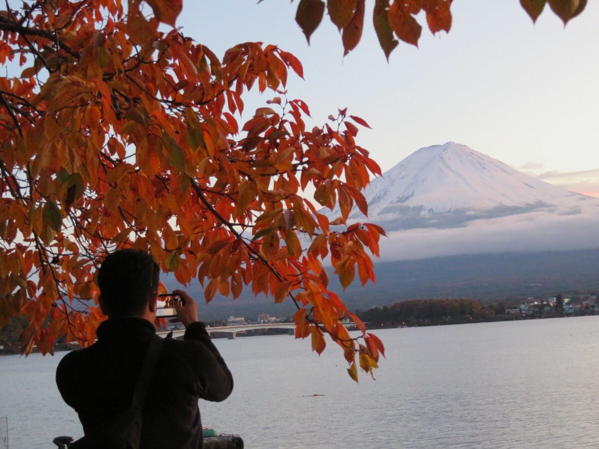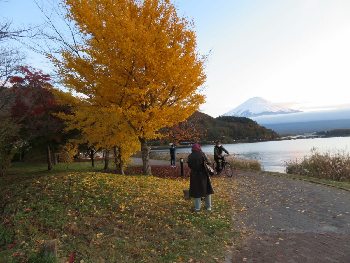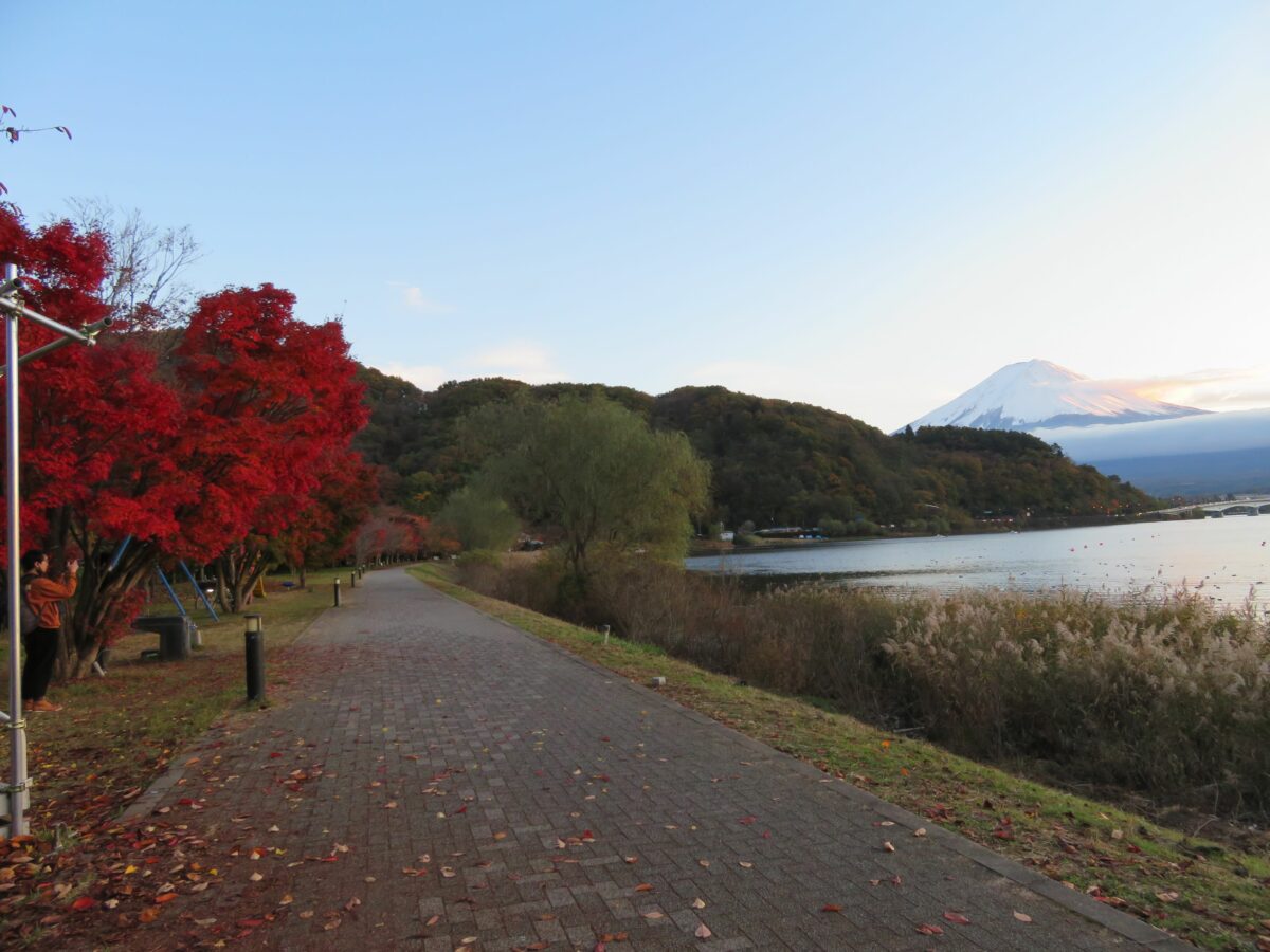 湖畔を散策していると紅葉越しの富士山や河口湖の姿を望むことができます。
