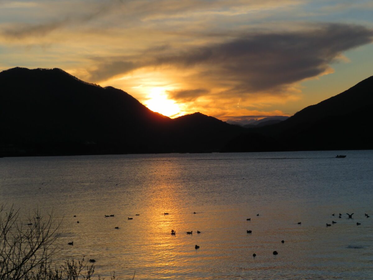 河口湖の先に沈む夕陽