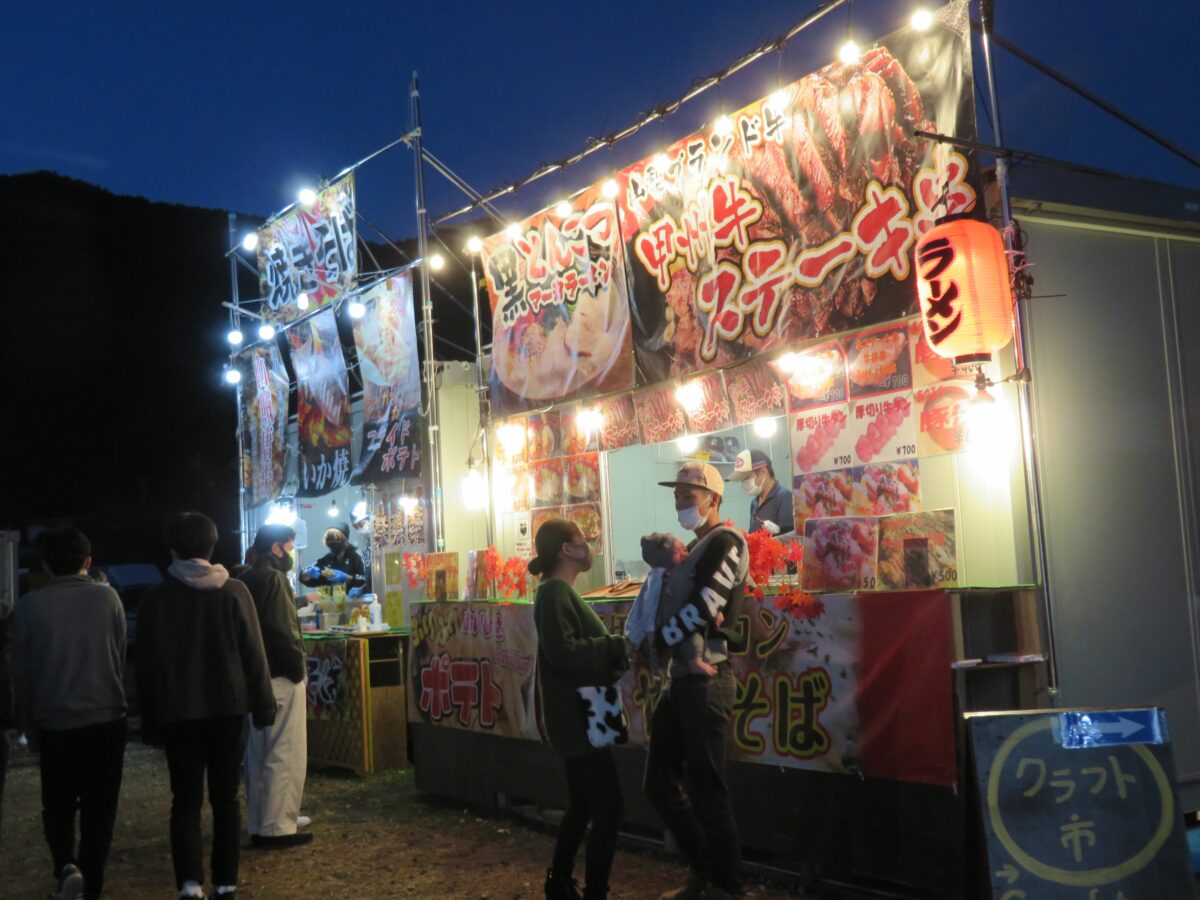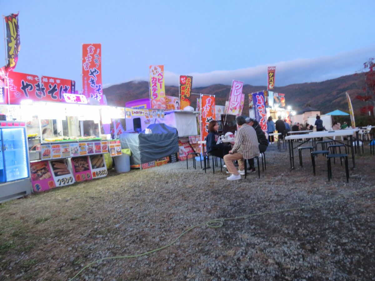 「もみじ回廊」の東エリアは露店ブースとなり、多彩なメニューを揃えた店が軒を連ねます。ほうとうや、富士宮やきそば、甲州牛ステーキなどのご当地グルメを味わうことができます。