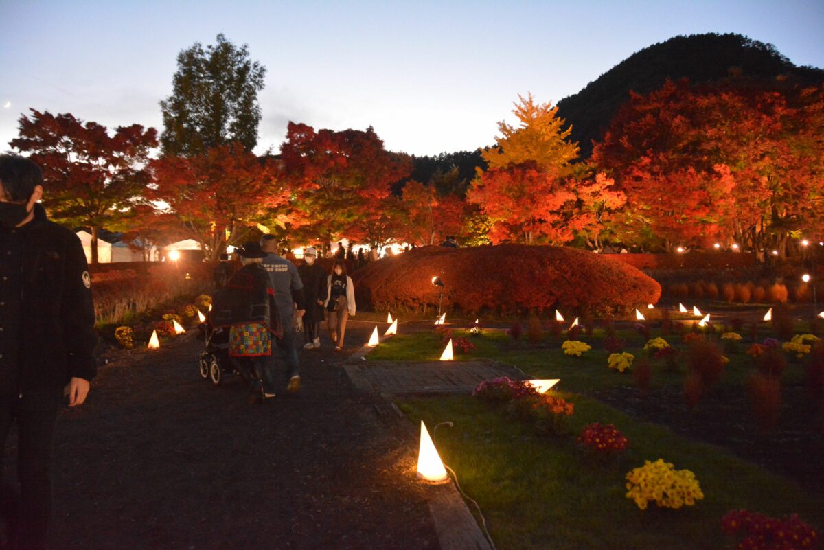 青空の下の河口湖畔には穏やかな秋を感じることができますが、「富士河口湖紅葉まつり」の最大の魅力は日没から夜間でしょう。