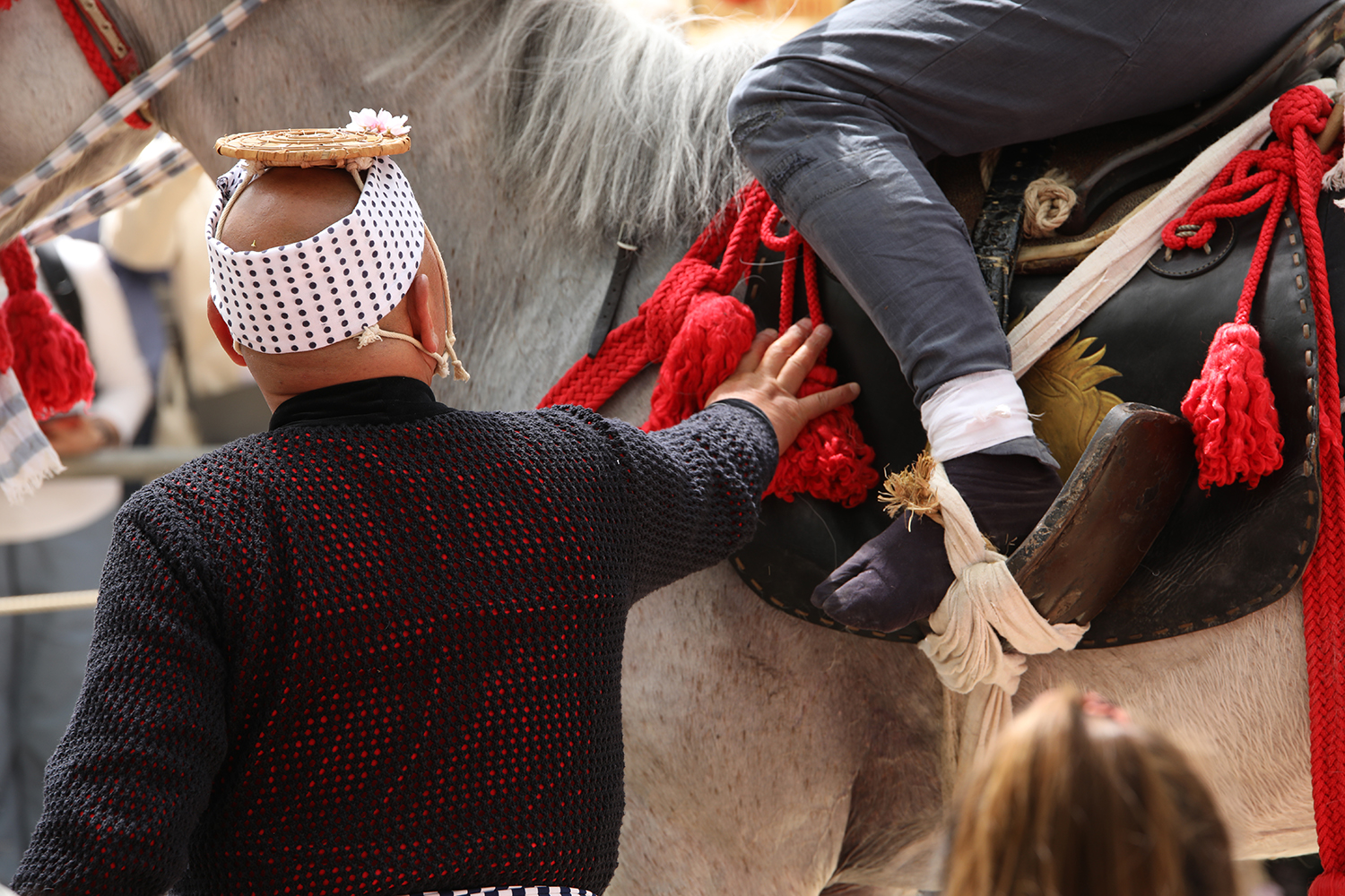 駈馬の衣装はかつて防具だったものが今は飾りのようになっています。たとえば頭につけている「バッチョ笠」は昔のヘルメット。赤いシャツに羽織っている黒い網襦袢(あみじゅばん)は鎖帷子(くさりかたびら)を表しています。