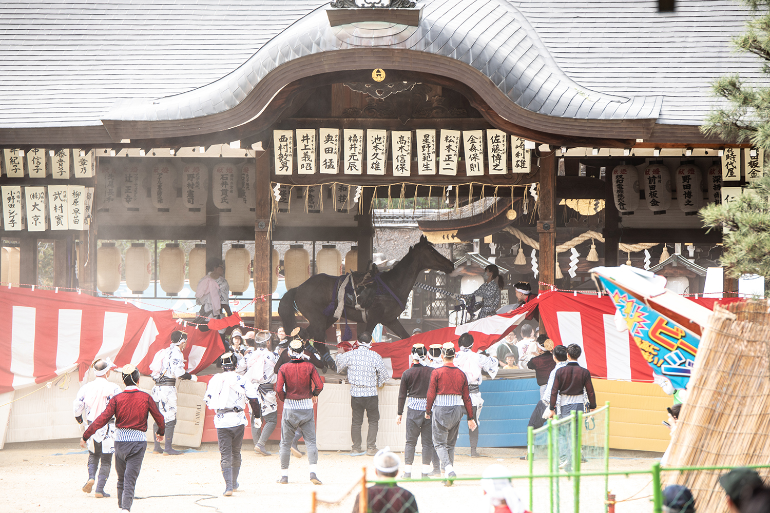 駈馬神事は南門から割拝殿(わりはいでん)まで伸びる約200メートルの参道で行われます。