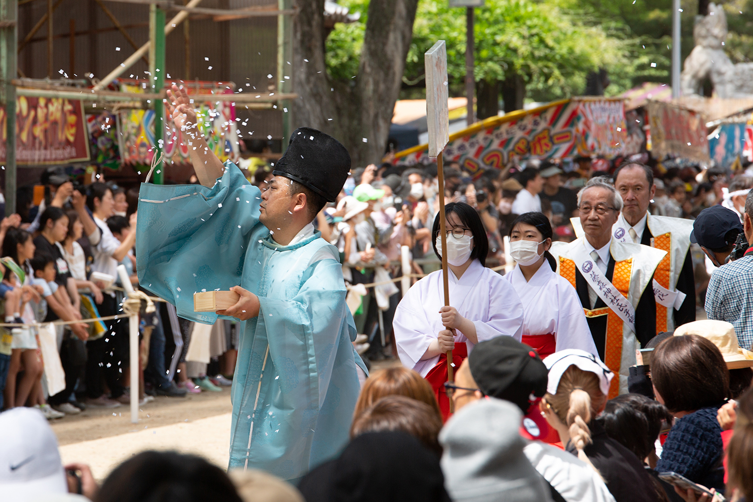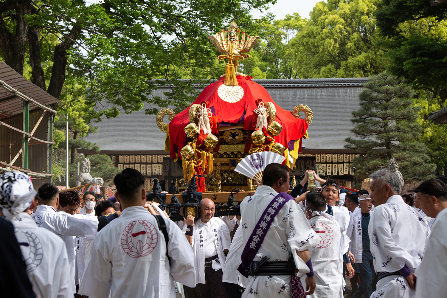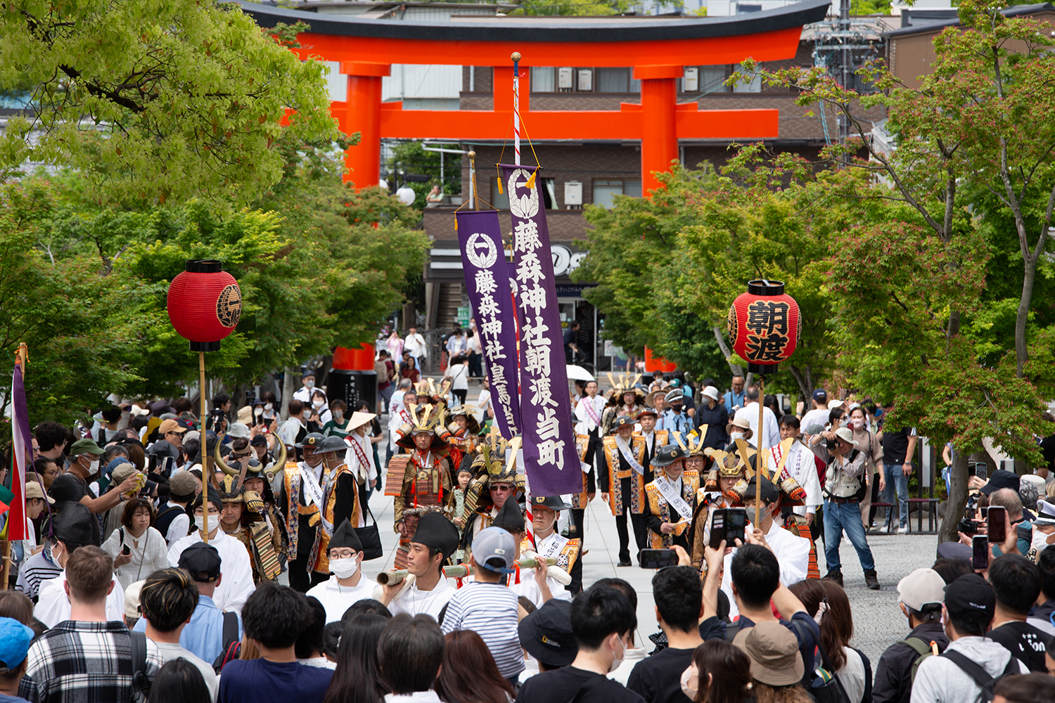 他に、祭神の早良親王(さわらしんのう)が戦勝祈願したときの行装をした朝渡(あさわたり)、藤森祭のもととなる「深草祭」(国の平和と清和天王の長寿を祈願する祭)の行装の皇馬(こんま)、この地に神祀り給うときの行装(神功皇后の凱旋の様子)の払殿(ほって)などの厳かな姿が見られます。