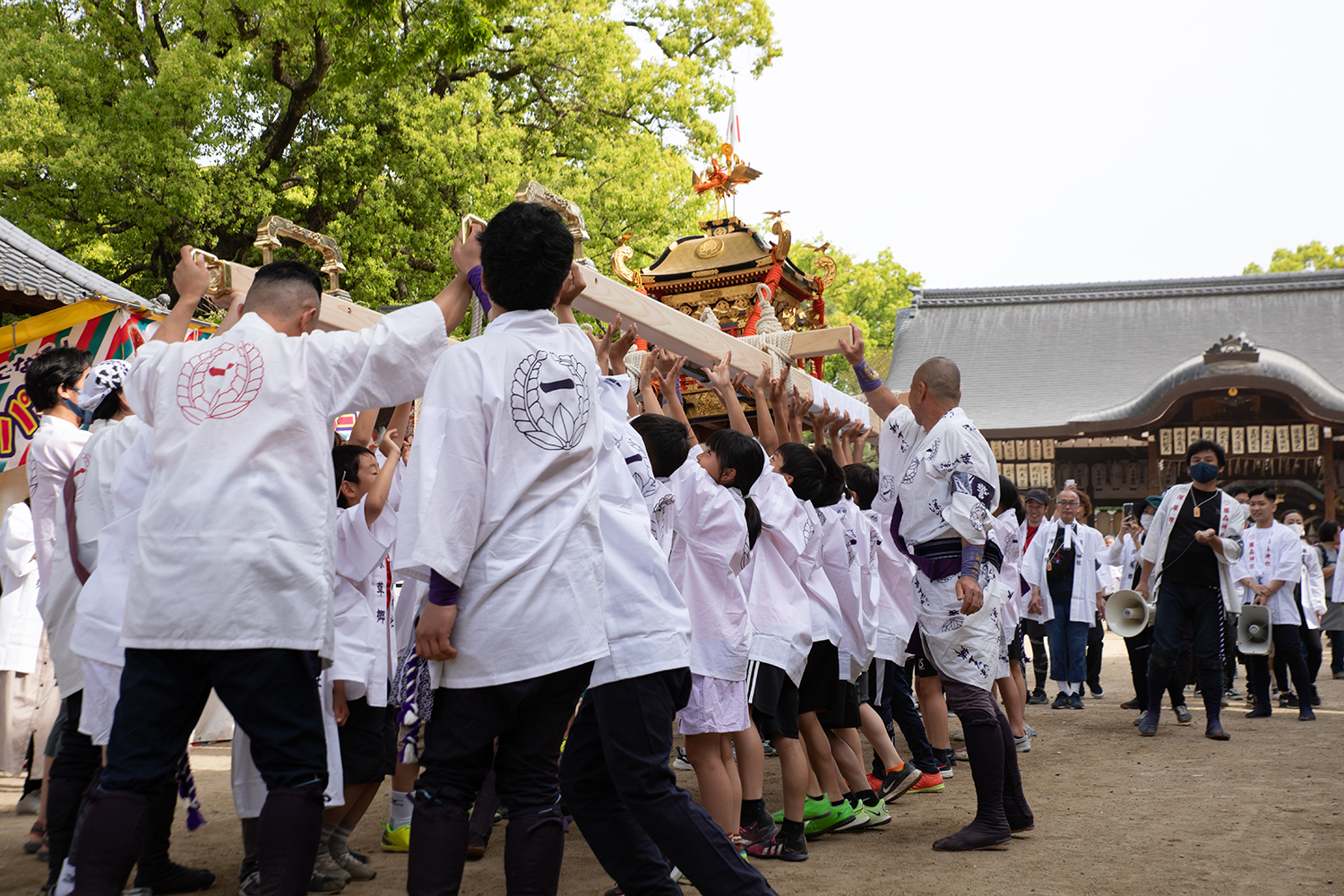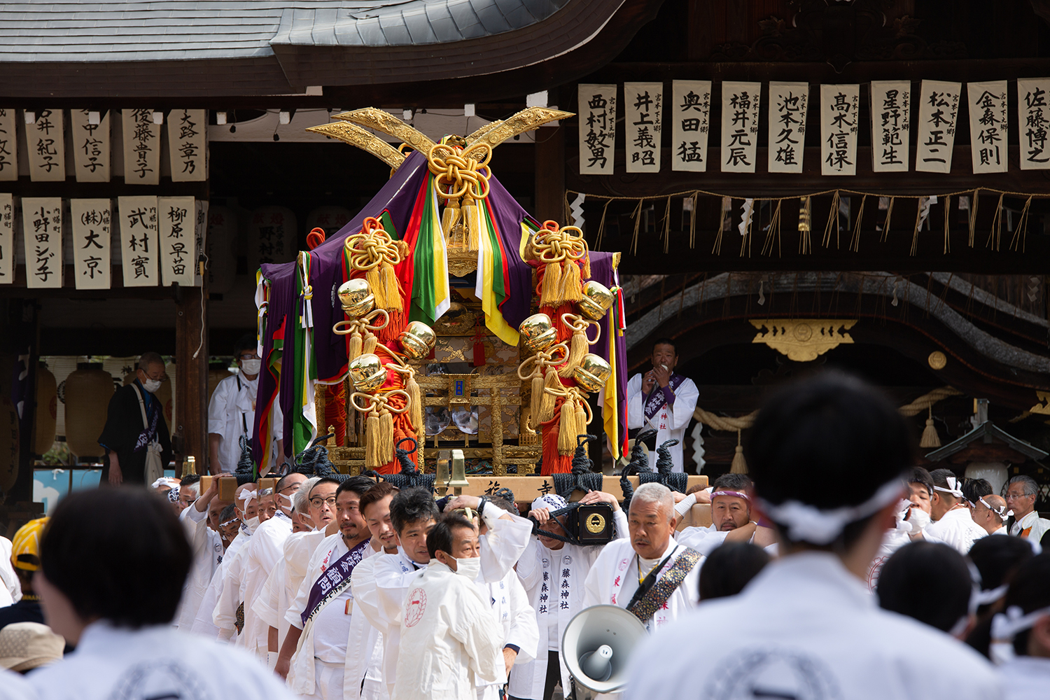 次に進んで来たのは東福寺郷神輿。屋根の上の部分が鳳凰ではなく、千木(ちぎ)になっているのが特徴的です。