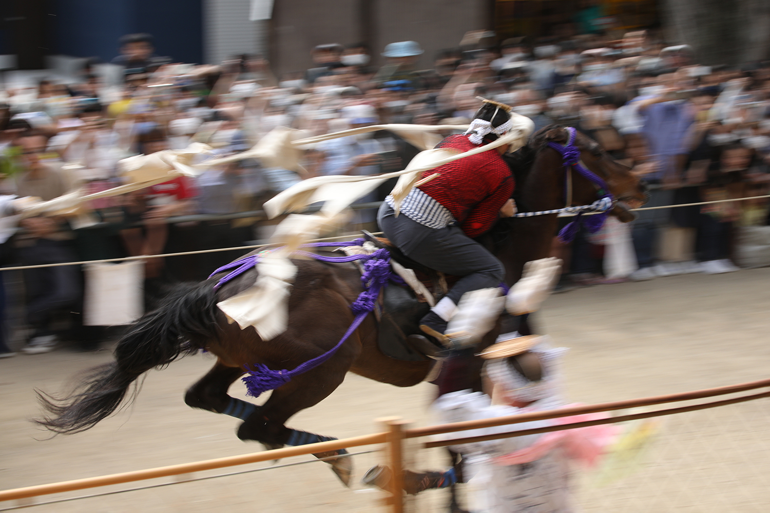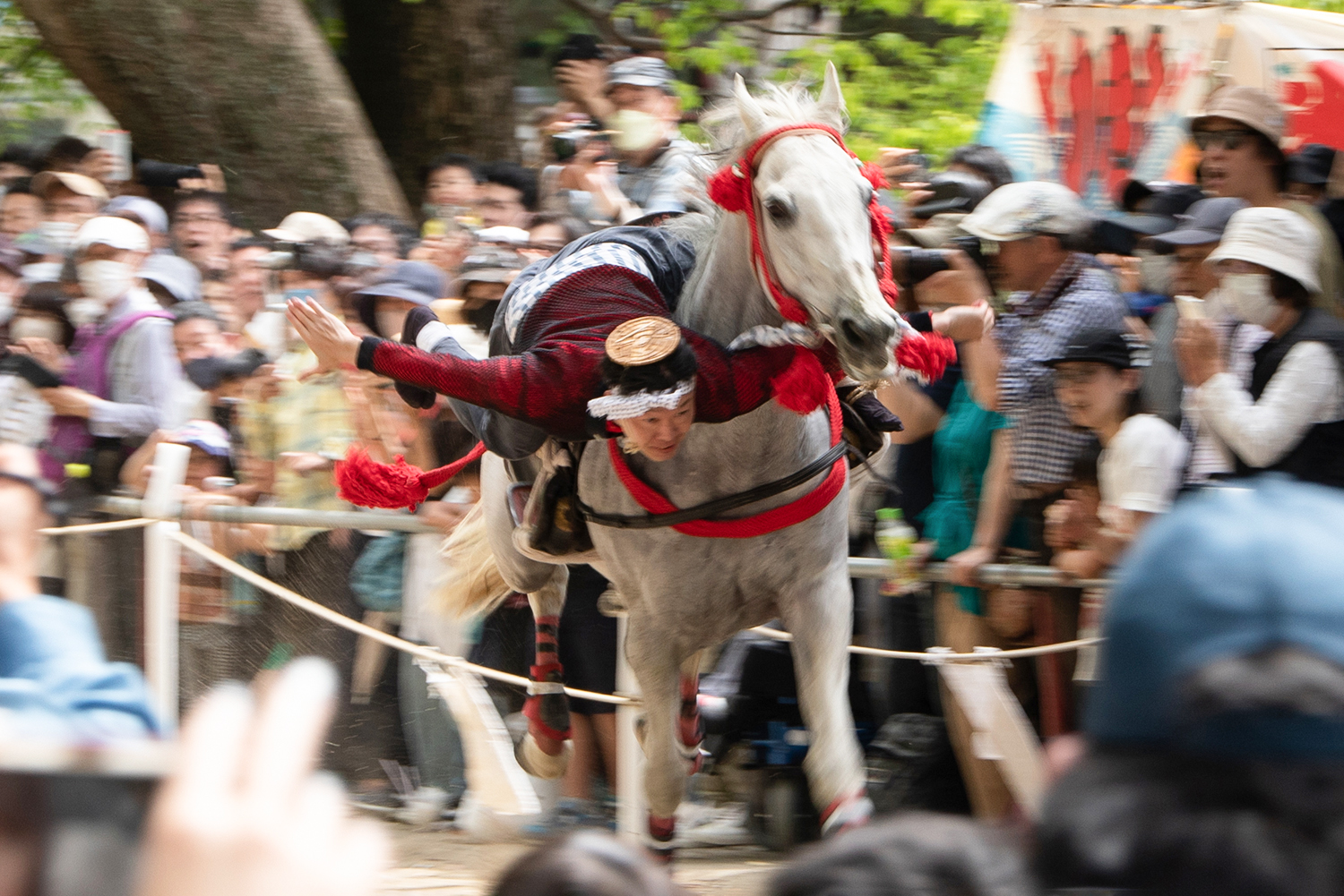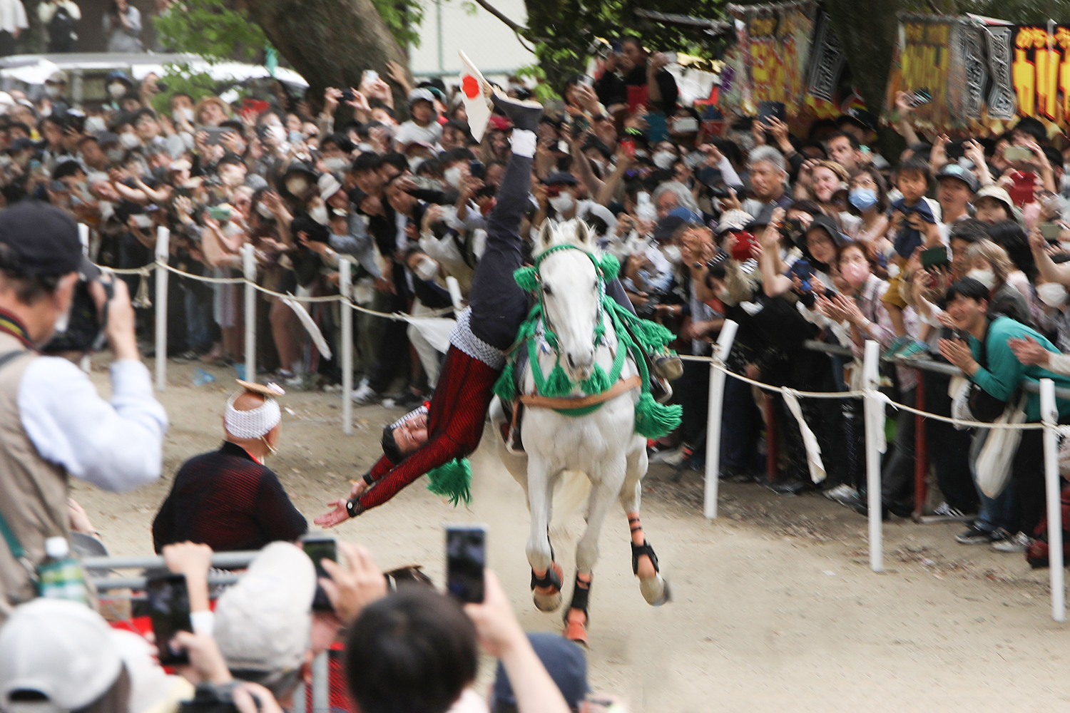 馬場のお祓いが終わると、最初は「素駈(すがけ)」が行われます。この素駈はいわば準備体操。スタートから止まるまでの距離感やどれくらいのスピードを出せばいいかを馬に教えるために行っており、素駈では技自体は行いません。しかし、目の前を駈け抜けるその速さや人馬一体となった迫力に歓声があがります。