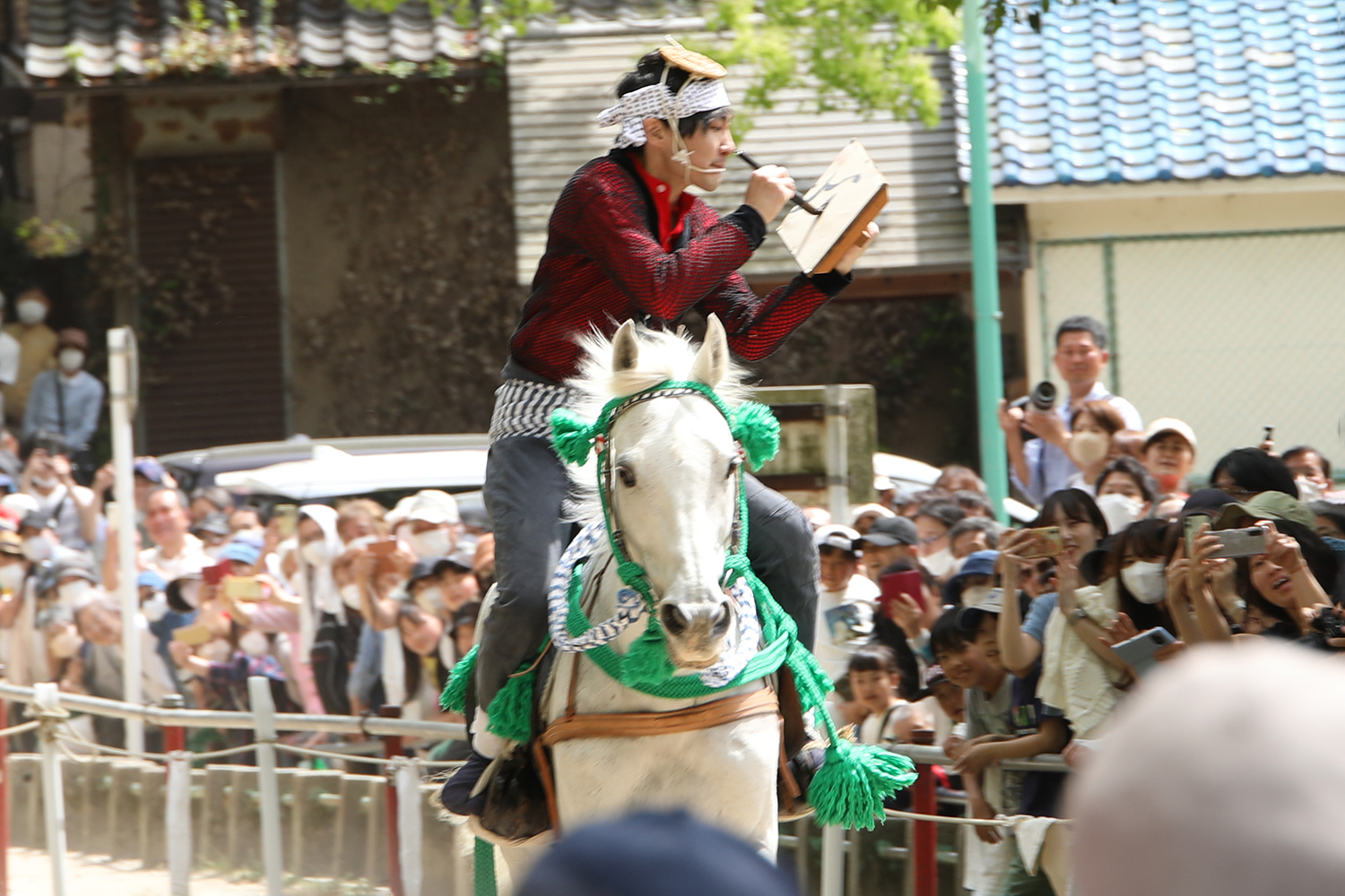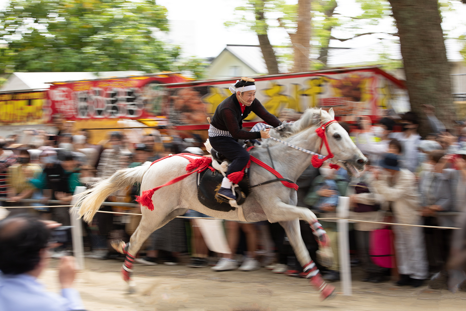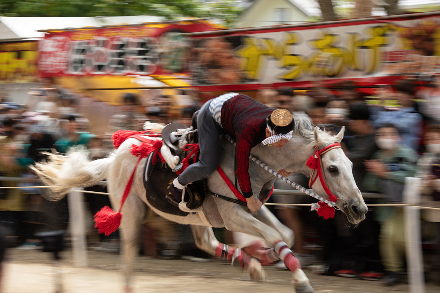 馬場のお祓いが終わると、最初は「素駈(すがけ)」が行われます。この素駈はいわば準備体操。スタートから止まるまでの距離感やどれくらいのスピードを出せばいいかを馬に教えるために行っており、素駈では技自体は行いません。しかし、目の前を駈け抜けるその速さや人馬一体となった迫力に歓声があがります。