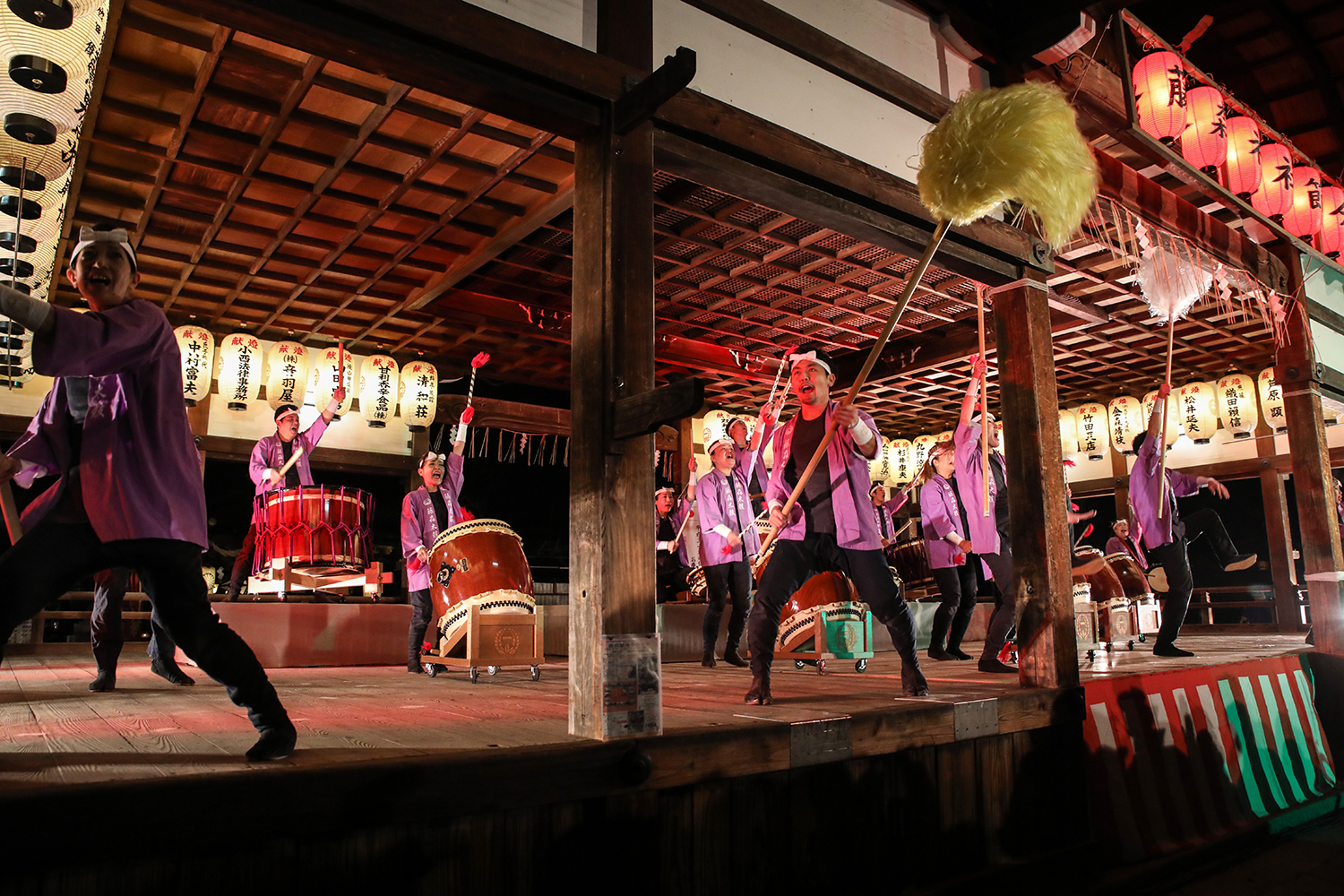 節分祭の藤森太鼓。華やかな舞台を繰り広げる。