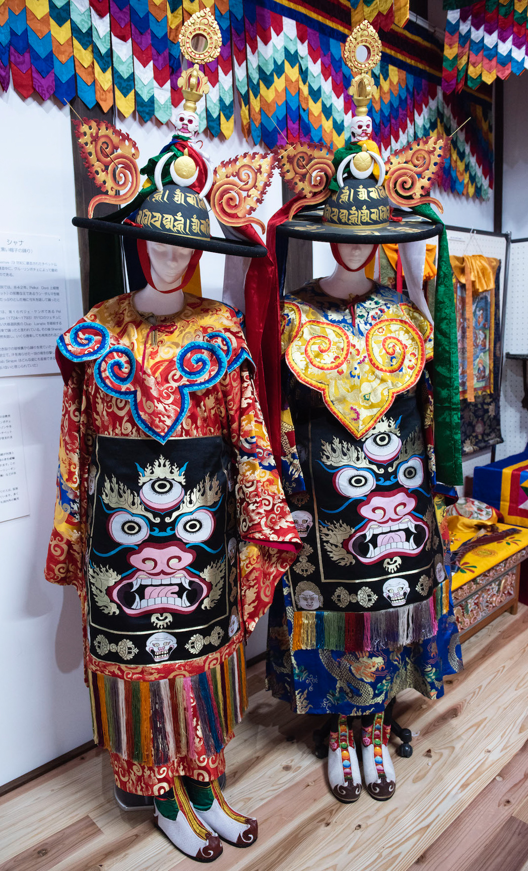 お祭りに関する展示は、ブータンの色彩豊かな文化を存分に感じられた。日本の装飾と比べれば断然派手で、ブータンは国全体が色に溢れていてそれぞれのデザインに意味がある。例えば、ブータンの国旗はお坊さんの色(オレンジ)と国王の色(黄)が使われている。お祭りの衣装もこの写真のように、様々な色が使われておりとても鮮やかだ。ちなみにこの衣装が2タイプある理由は、悪いお坊さん(右)をよいお坊さん(左)が退治するという勧善懲悪のストーリーを演じるためである。