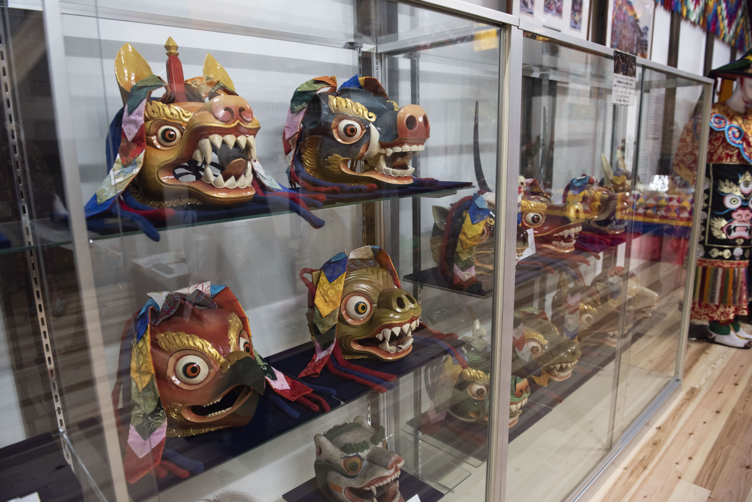 また、ブータンの仮面は十二支を表している。丑だけ目玉が3つあり、骸骨が付いているという。また、日本の能面にも似た鼻が高い面や、おばあさんの面なども飾られていた。獣を模した仮面からは、日本の獅子舞やしし踊りの文化との繋がりも少なからず感じた。