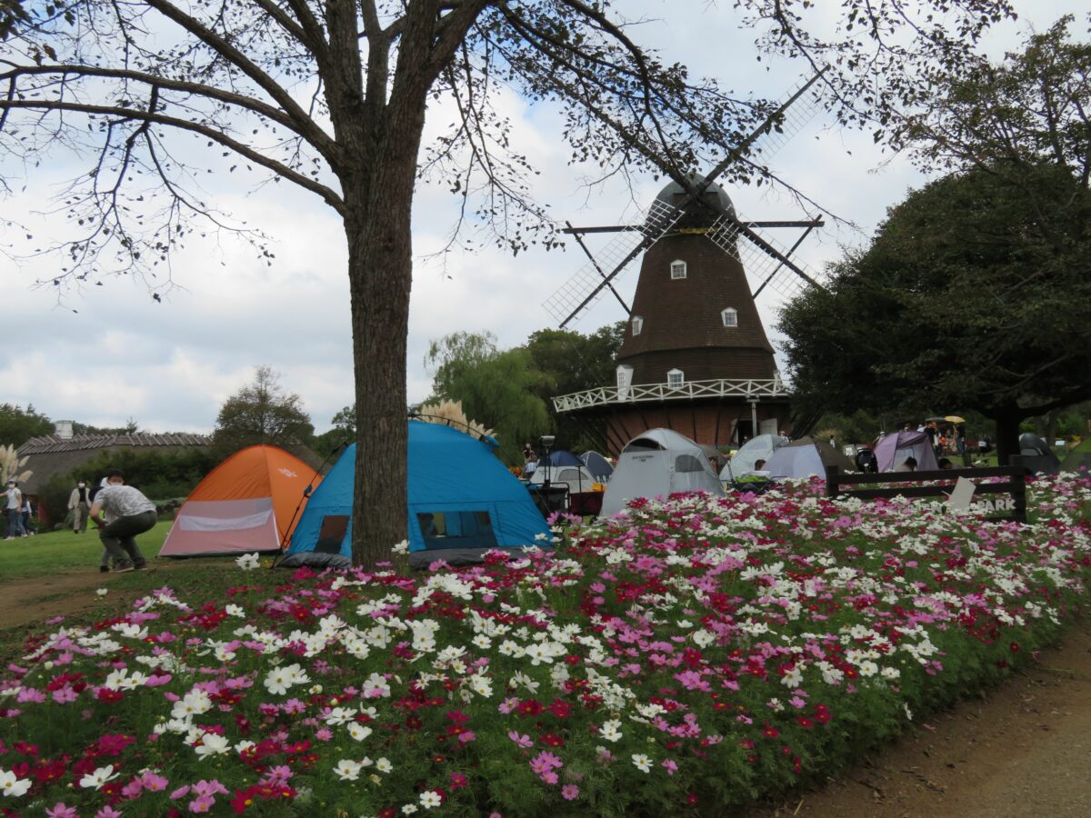 風車とコスモス畑の広場では、テントを張ることができるので、腰を据えて花を観賞することができます。