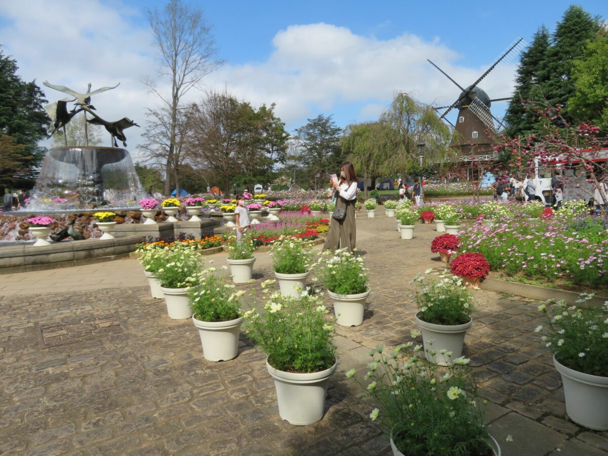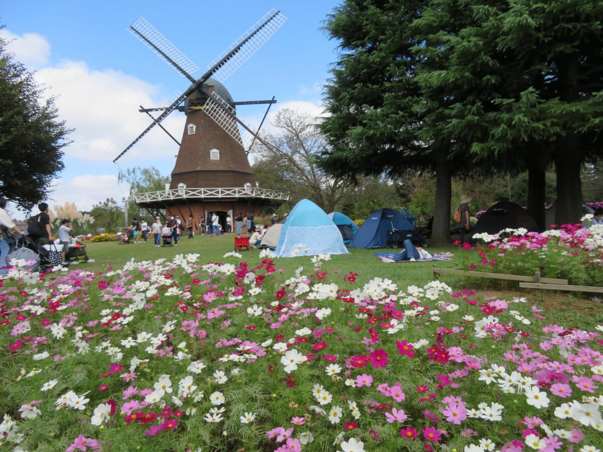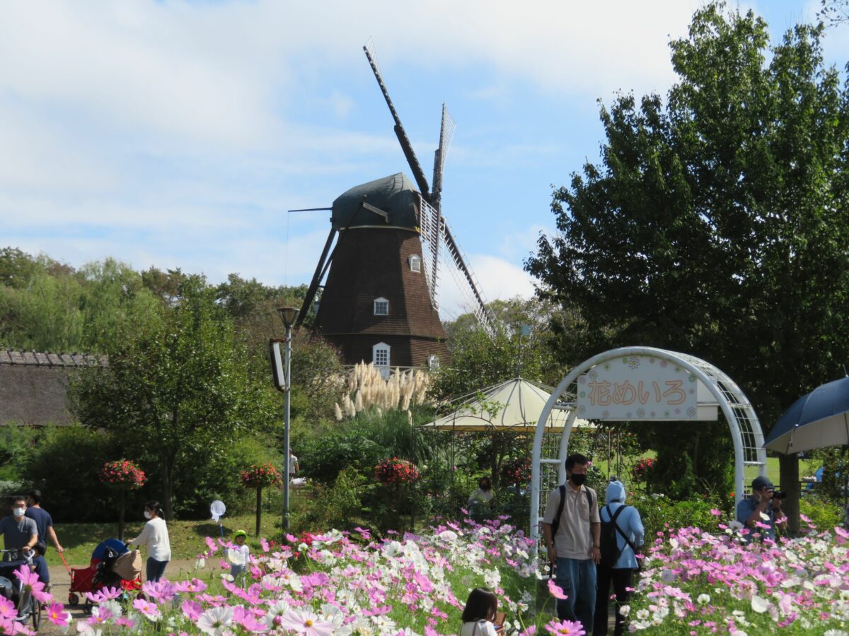 千葉県船橋市の「ふなばしアンデルセン公園」では例年10月に、「ふなばしアンデルセン公園コスモスまつり」が開催され、約10万株のコスモスで彩られます。メルヘンの丘ゾーンの風車やイベント広場は秋の彩りで包まれ、メルヘンの丘に設けられるコスモス迷路では全身がすっぽりと豊かな色彩のコスモスで覆われます。