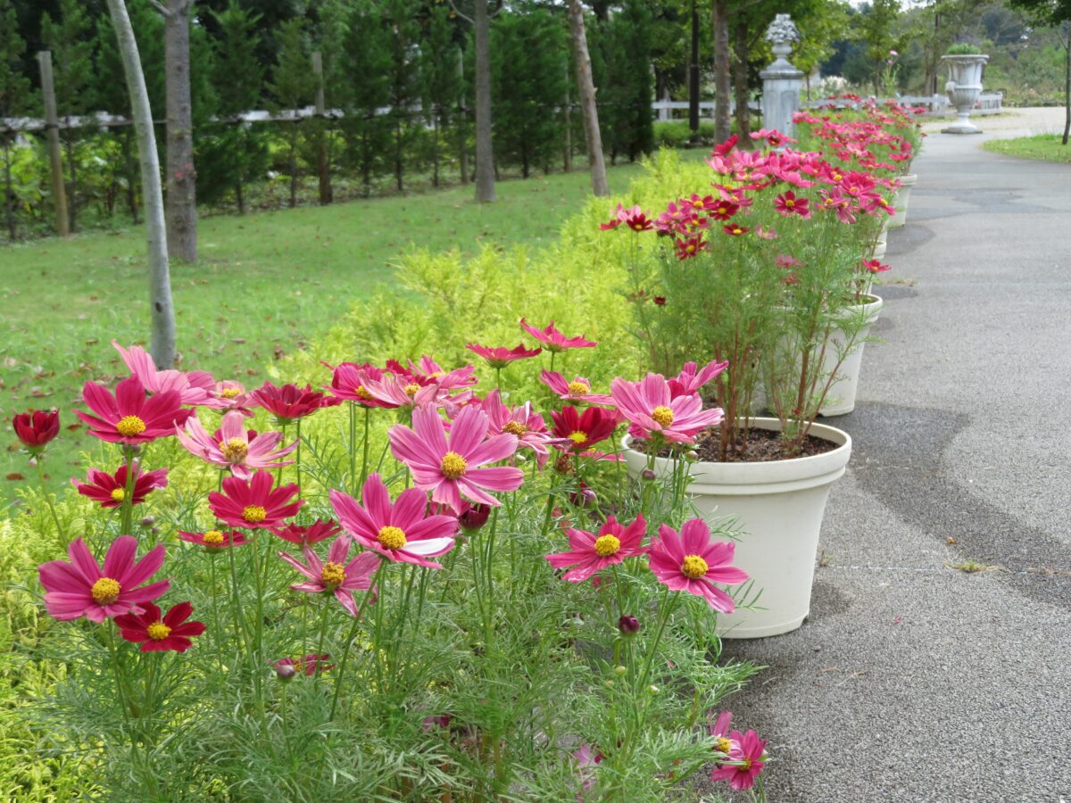 メルヘンの丘ゾーンだけでも季節の花を堪能することができますが、他のゾーンでも種類豊富なコスモスを見ることができます。園内全体では約10万株のコスモスが育てられているのです。ワンパク王国ゾーンのイベントドーム前の花壇にはコスモスが列をなします。花の城ゾーンではハートのトピアリーにコスモスが寄り添い、芝生広場を囲む花壇でもコスモスの花を数多く見ることができます。