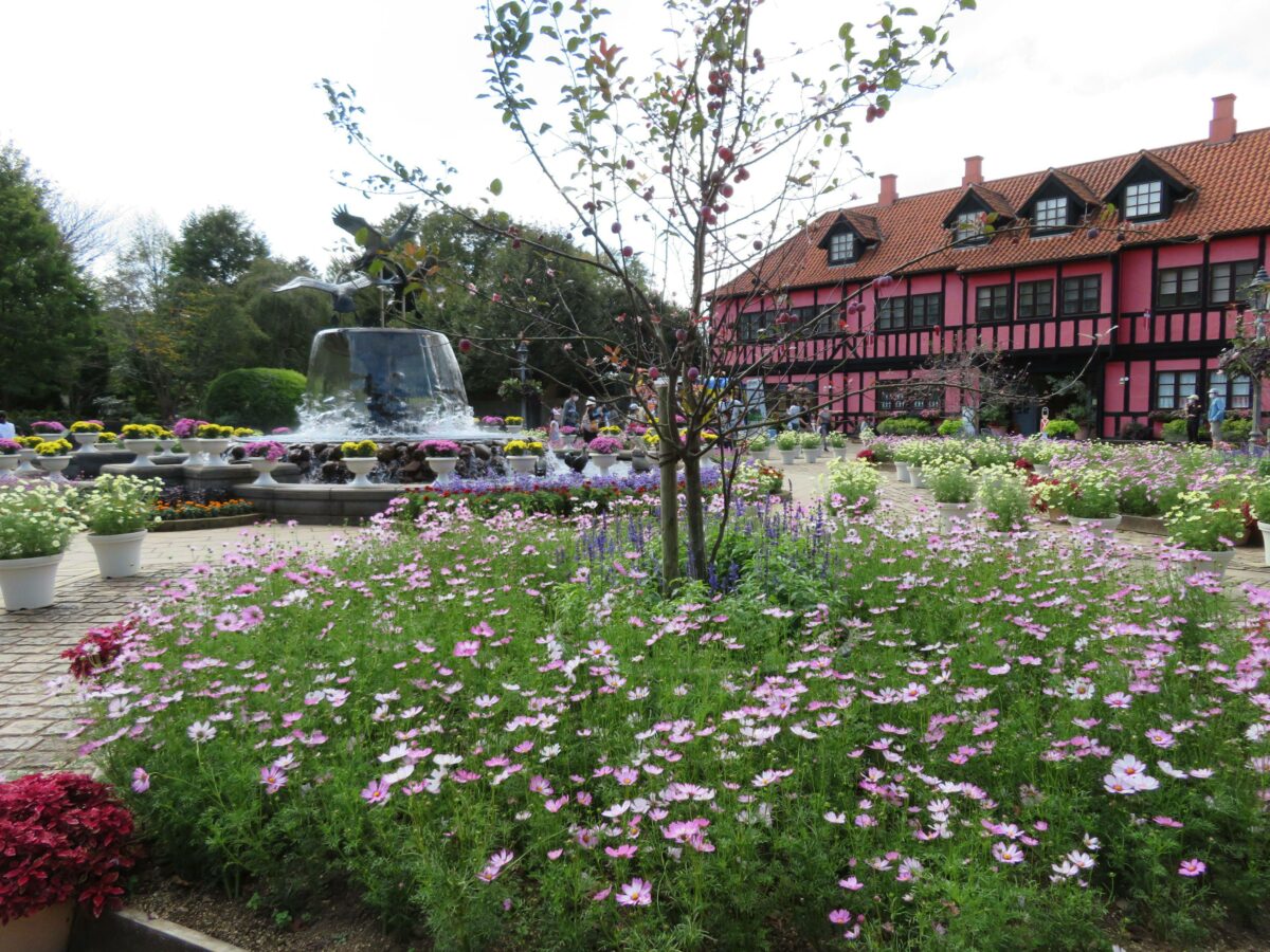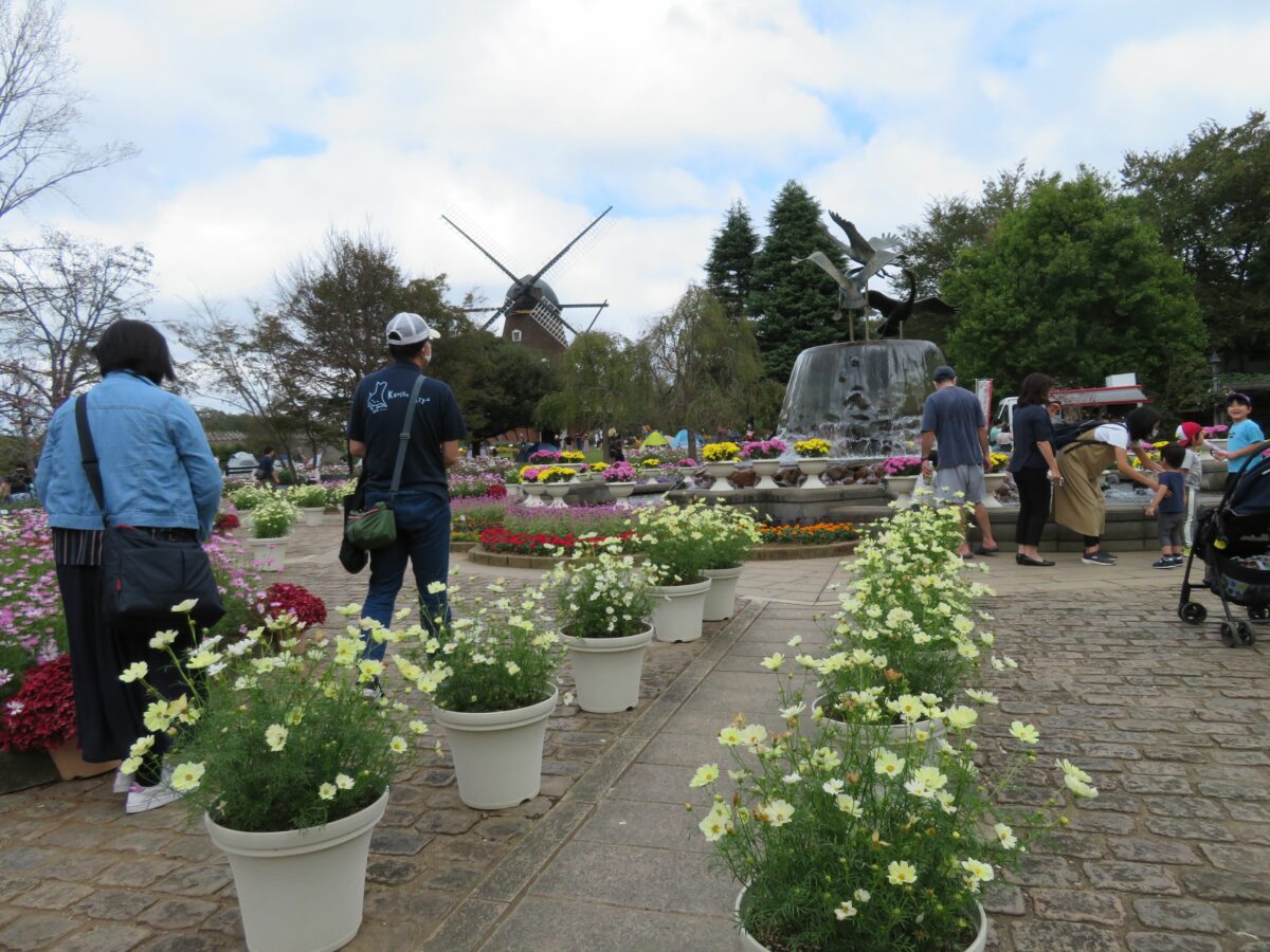 風車の南に隣接するイベント広場では、噴水を中心としてコスモスが取り囲みます。噴水の水しぶきが、花に清々しい潤いを添えているようです。