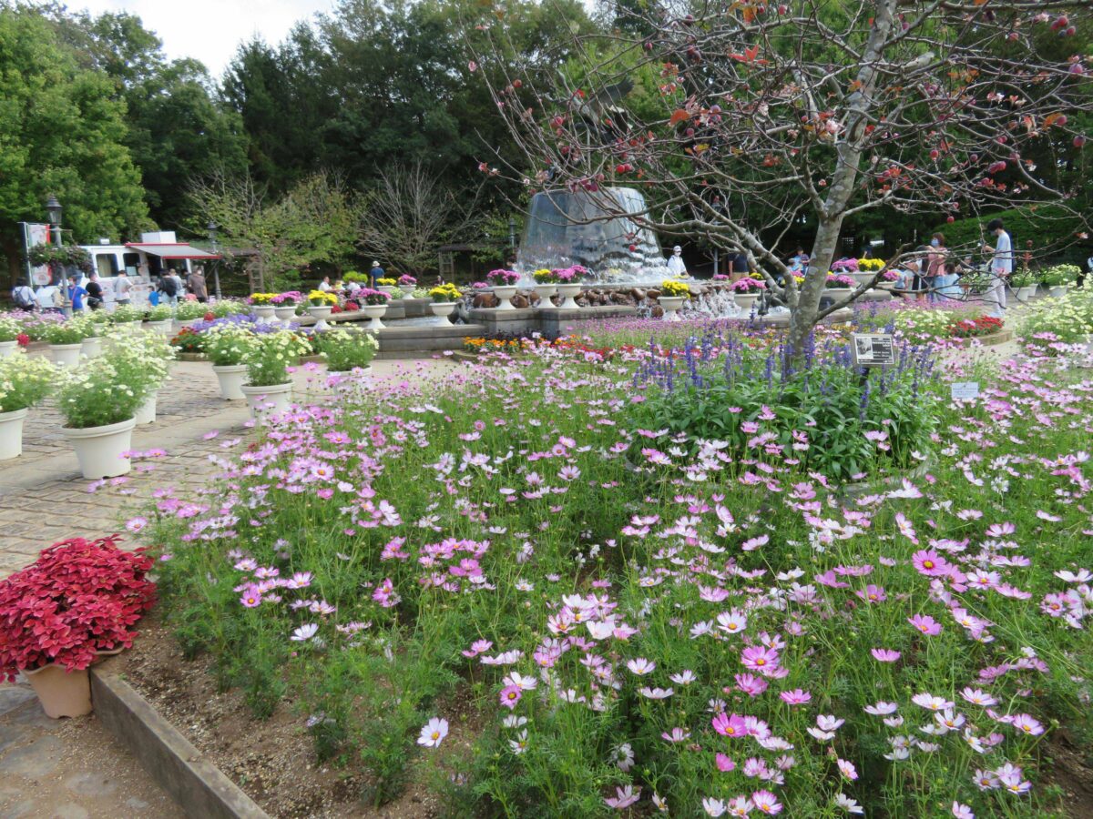 イベント広場の中心の噴水から同心円を描くコスモス花壇