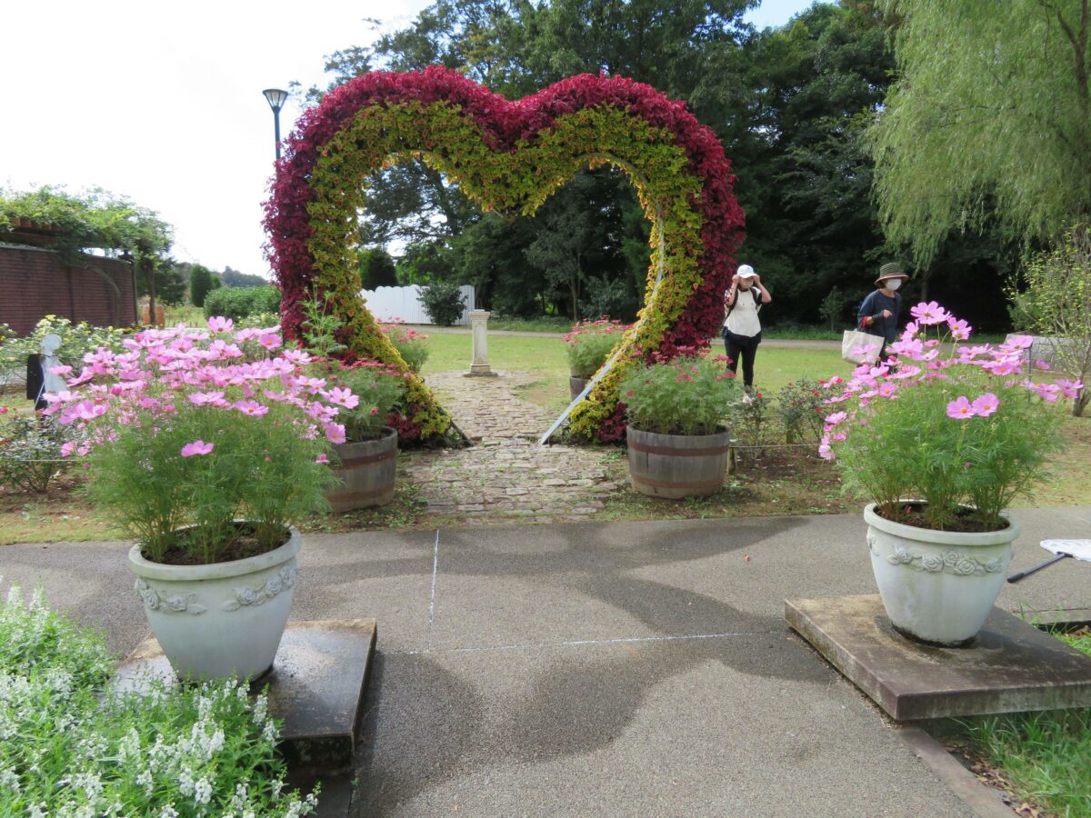 ハートのトピアリーに寄り添うコスモス