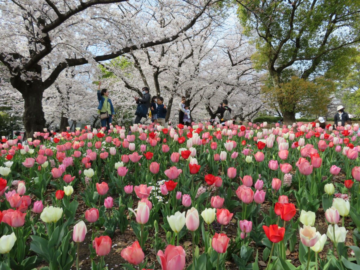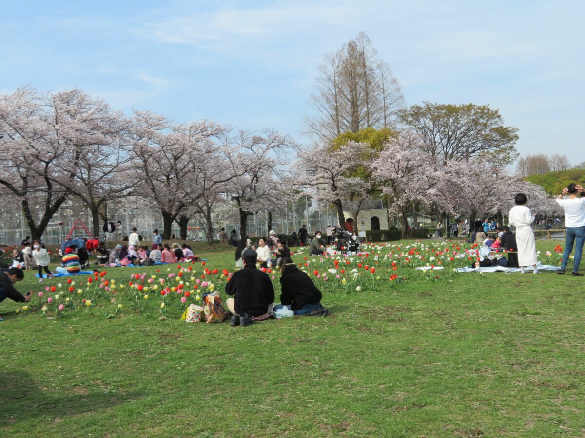 芝生広場の東には浮間ヶ池に接するようにチューリップ畑が設けられています。桜とほぼ同じ時期に開花するので、2種類の花を楽しむことができます。