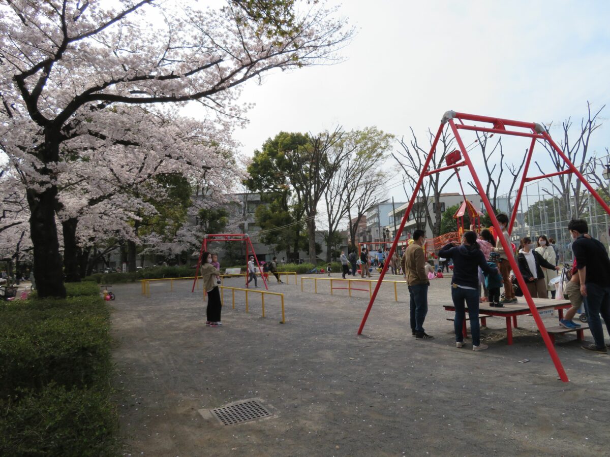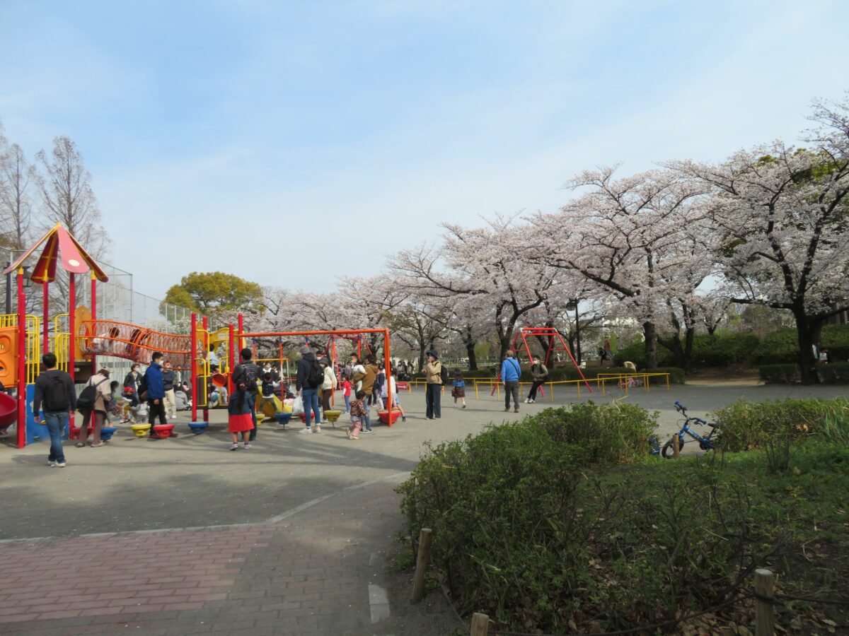 芝生広場の北にはこども運動広場が設けられ、広場も桜で取り囲まれ、遊具で遊ぶ子ども達も穏やかな春の気分を感じているようです。