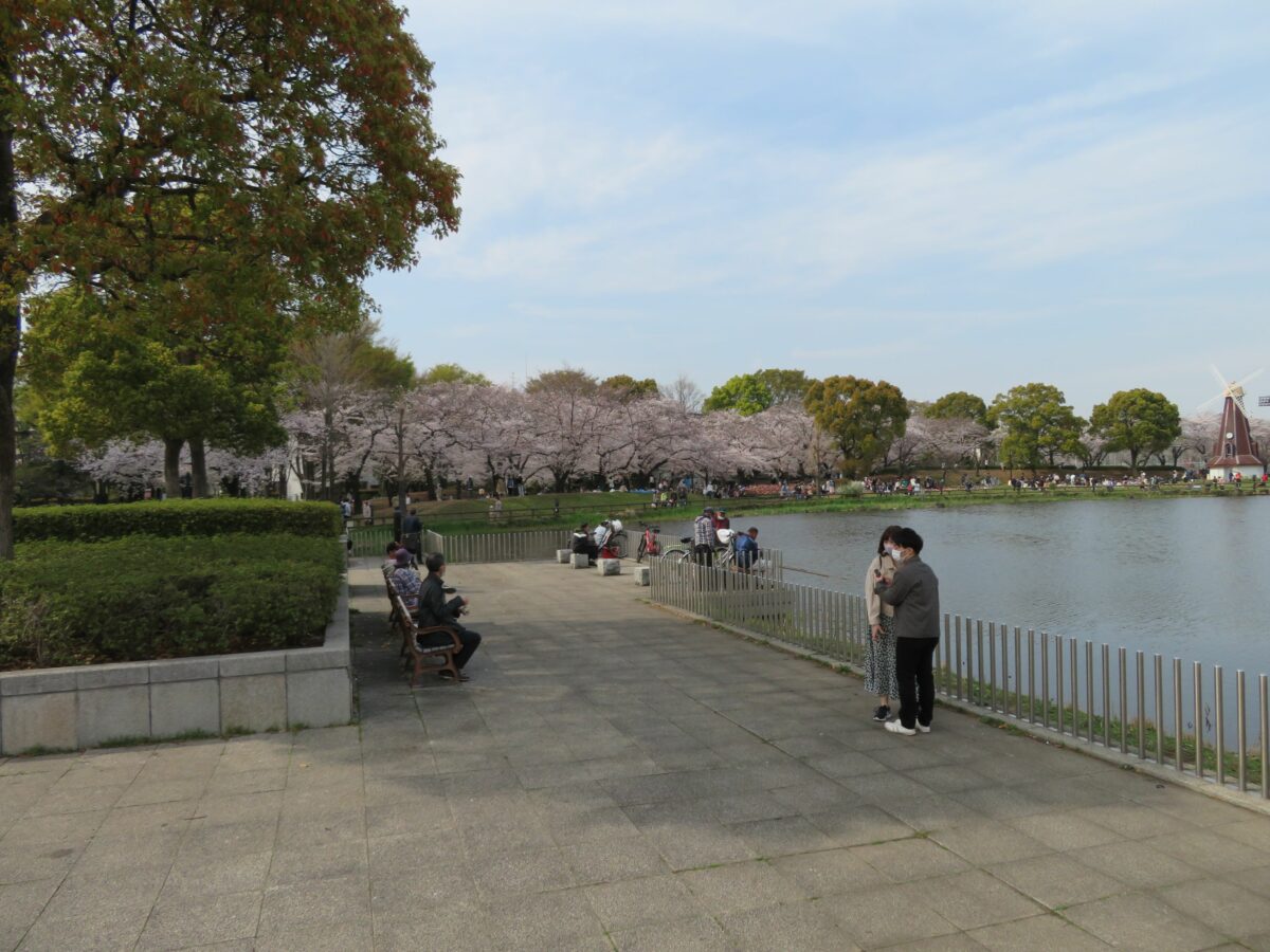 浮間公園では中央で静かな水面を湛える浮間ヶ池の周りをソメイヨシノが取り囲みます。2021年は気候の影響から3月25日前後に見頃となりました。