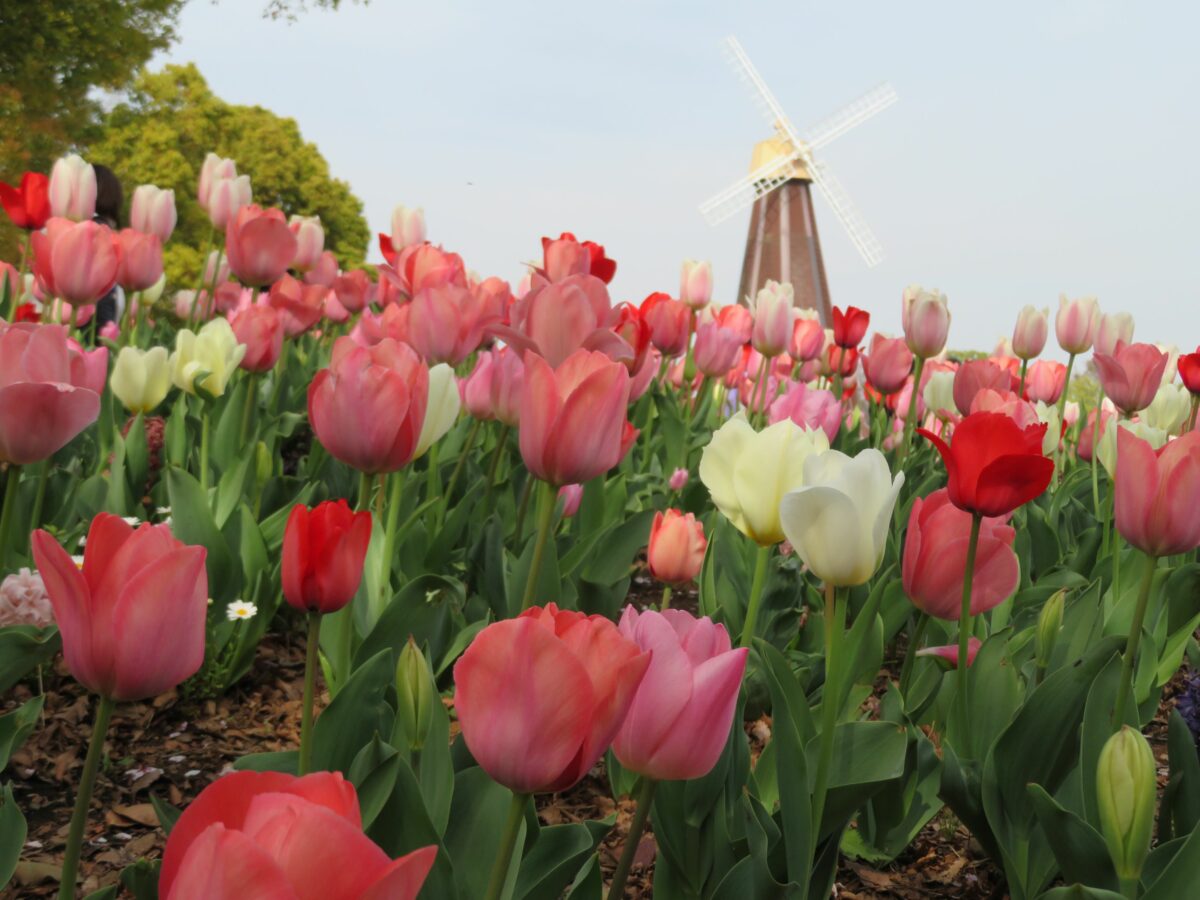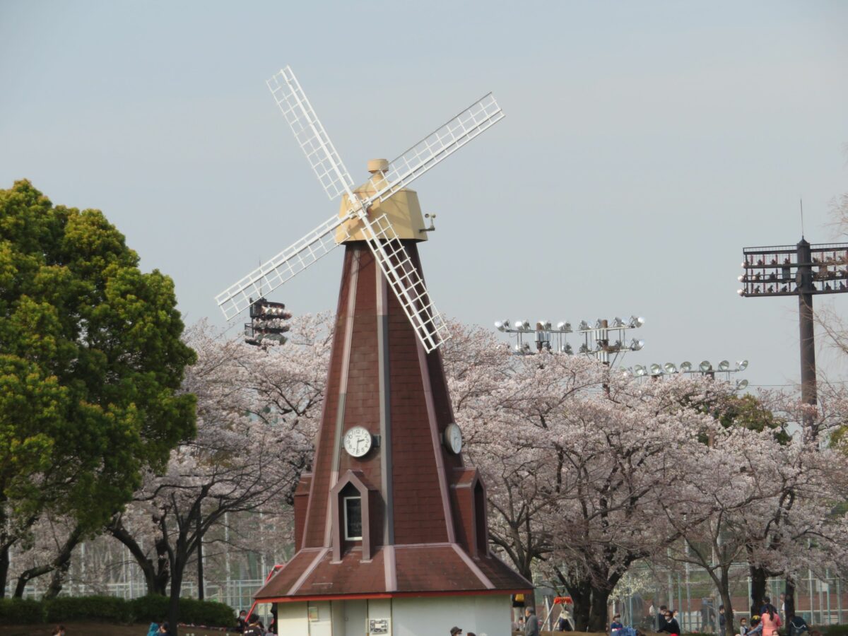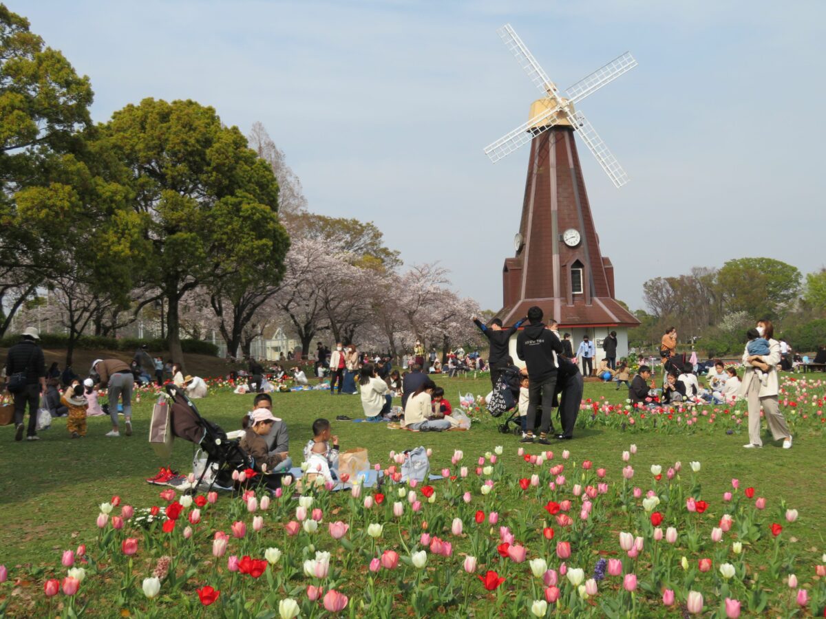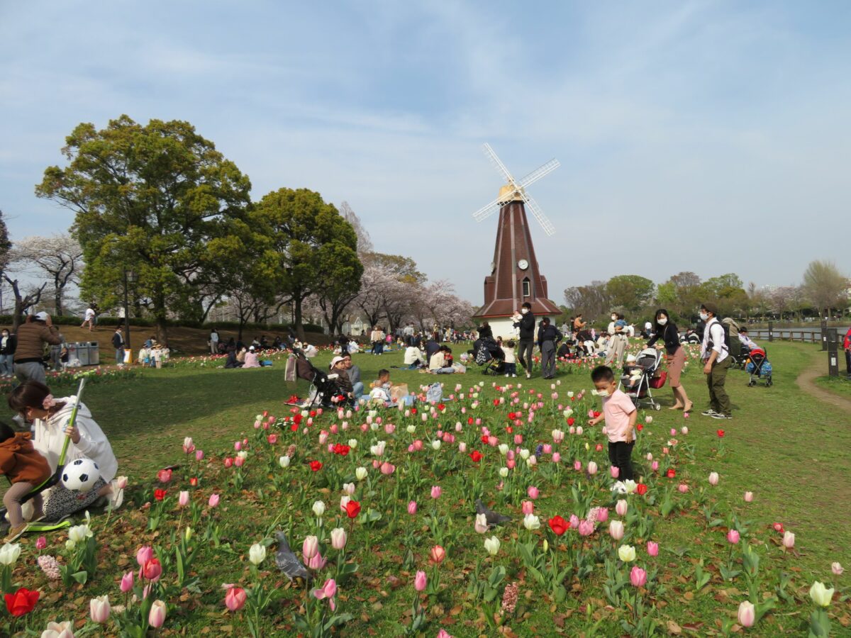 さらにチューリップ畑の北には、公園のシンボルとなっている風車が設置されています。桜、チューリップ、風車の彩りがバランスよく溶け合い印象的です。