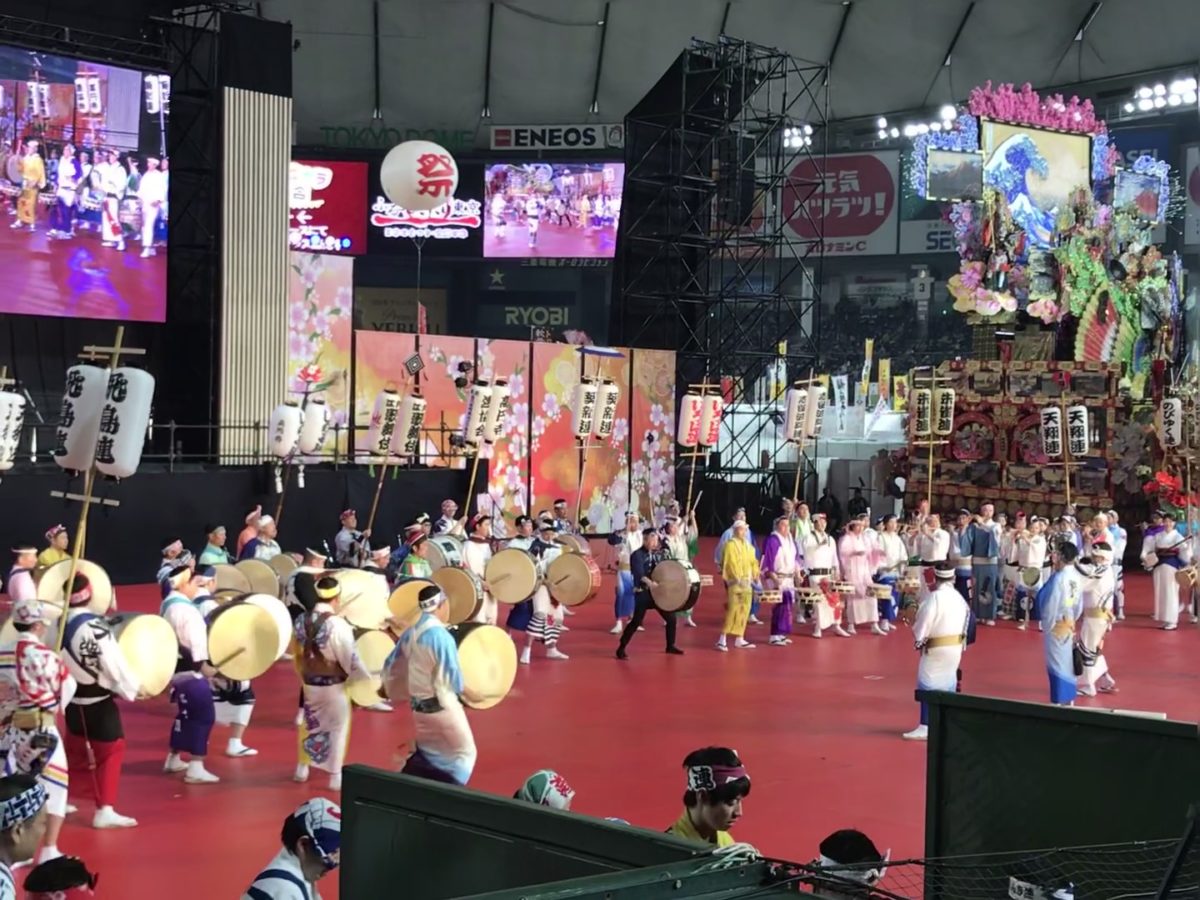 そして新婚ホヤホヤ、奥様とともに大太鼓を叩くKさんも初舞台。「昨年までは毎年観る側で楽しませていただいていましたが、今回初めて東京ドームの大舞台に参加させていただくこととなり、感無量です。また、休憩時間には日本各地の美味しいものを食べたり、賑やかなお祭りを観たりできて、本当に楽しかったです。全てを出し切った後のビールは、とにかく最高でした!」