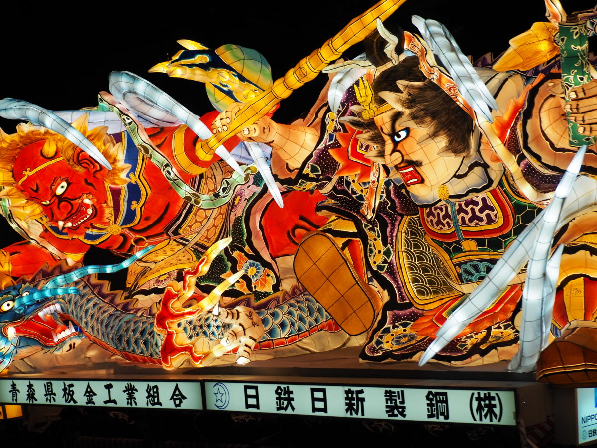 青森からトラック8台(ねぶた部分5台、台車部分3台)で今回のために運んできたのは2019年の本祭に登場した『「舎利」韋駄天と足疾鬼(しゃり いだてんとそくしっき』。2019年12月に行われた国立競技場のオープニングイベントにも登場するなどで大活躍中です。