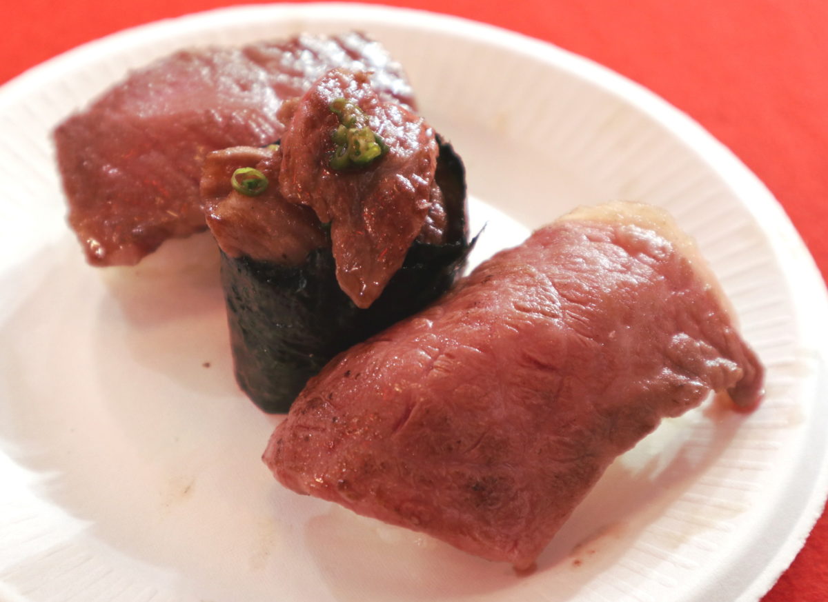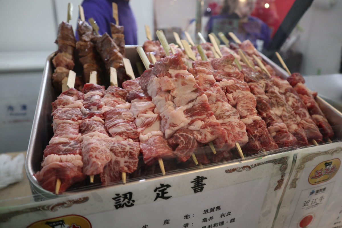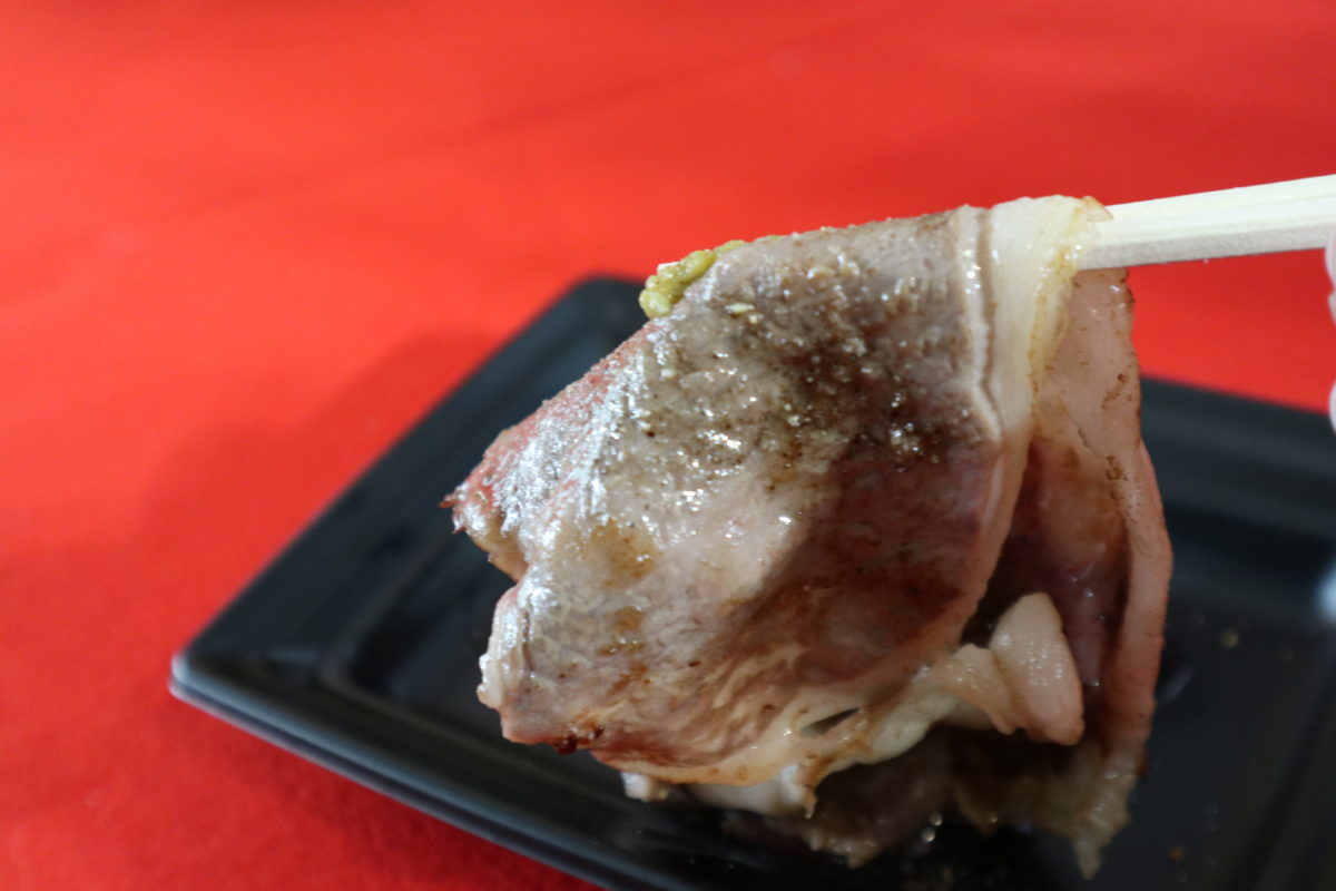 定番の「ステーキ串」はもちろん、ふるさと祭り東京では「認定近江牛 3秒ステーキ」でサッと焼いて召し上がれます。ジューシーな脂ですが、柚子胡椒がアクセントになっています。