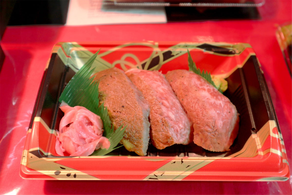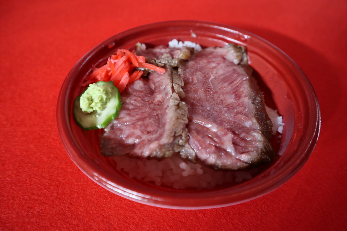 夏と冬の寒暖差、冬の厳しい寒さといった厳しい自然環境のもと、ギュっと旨味が凝縮され美しいサシが入った尾花沢牛。「雪降り和牛」とも呼ばれるそうです。「ローストビーフ握り寿司」「ステーキ握り寿司」、一番人気の「ステーキ&焼肉弁当」 いずれも同じ山形のブランド米「つや姫」を使用。