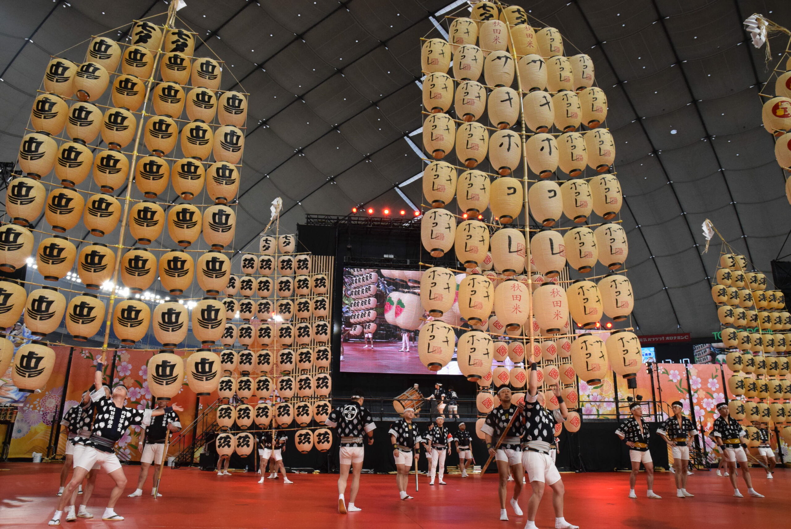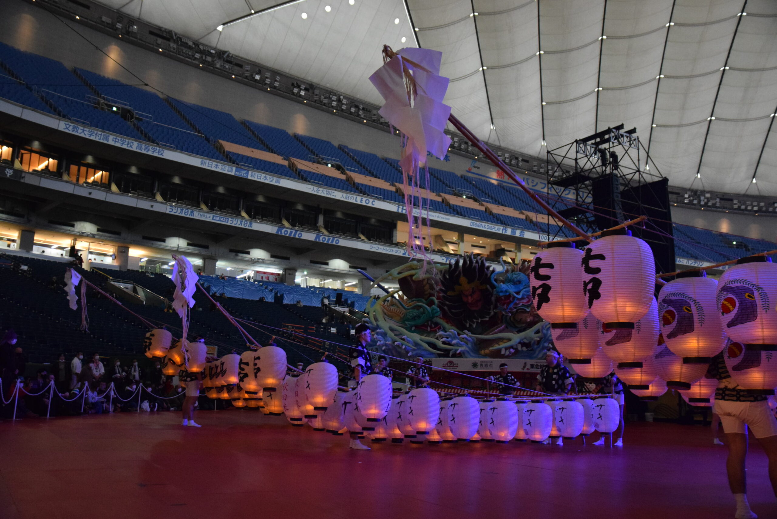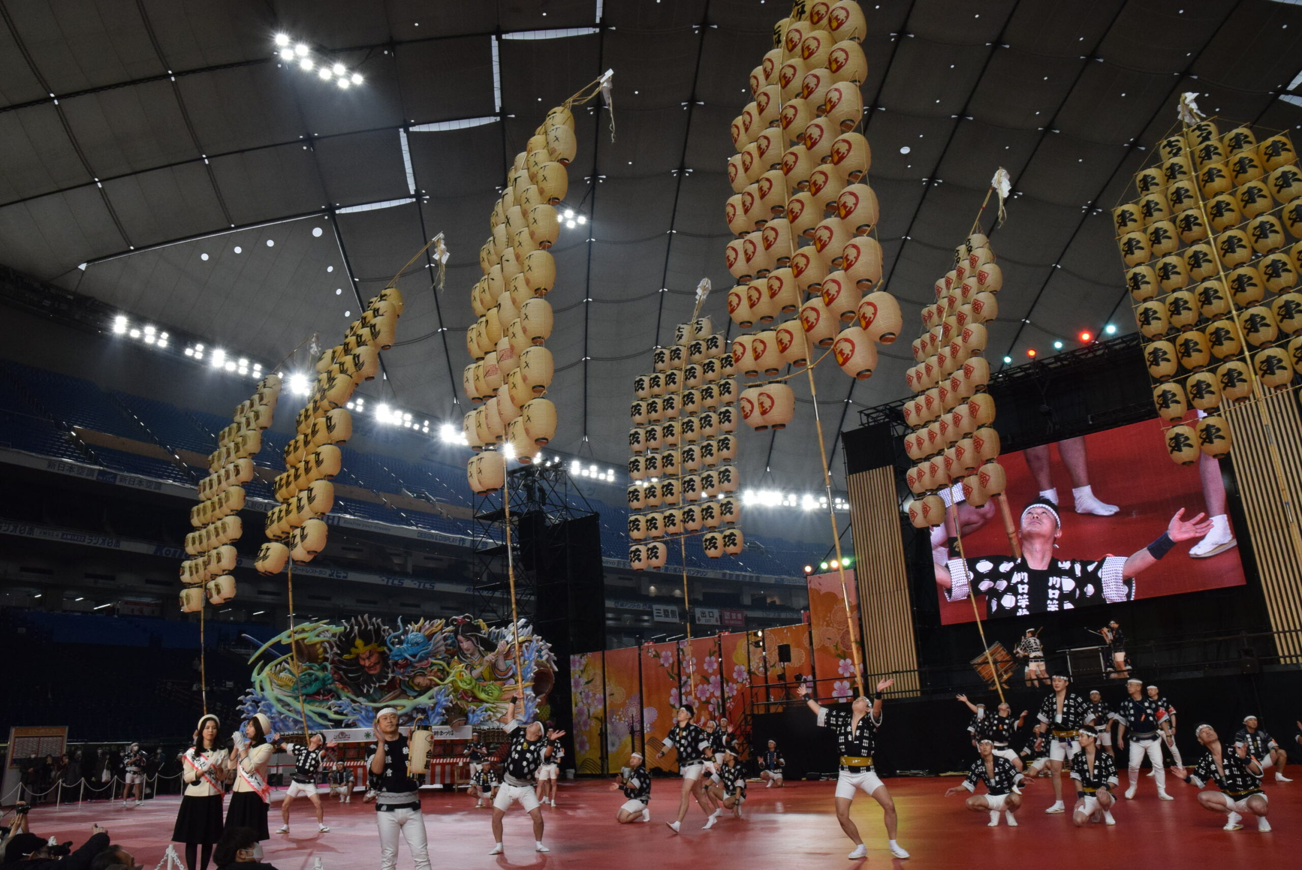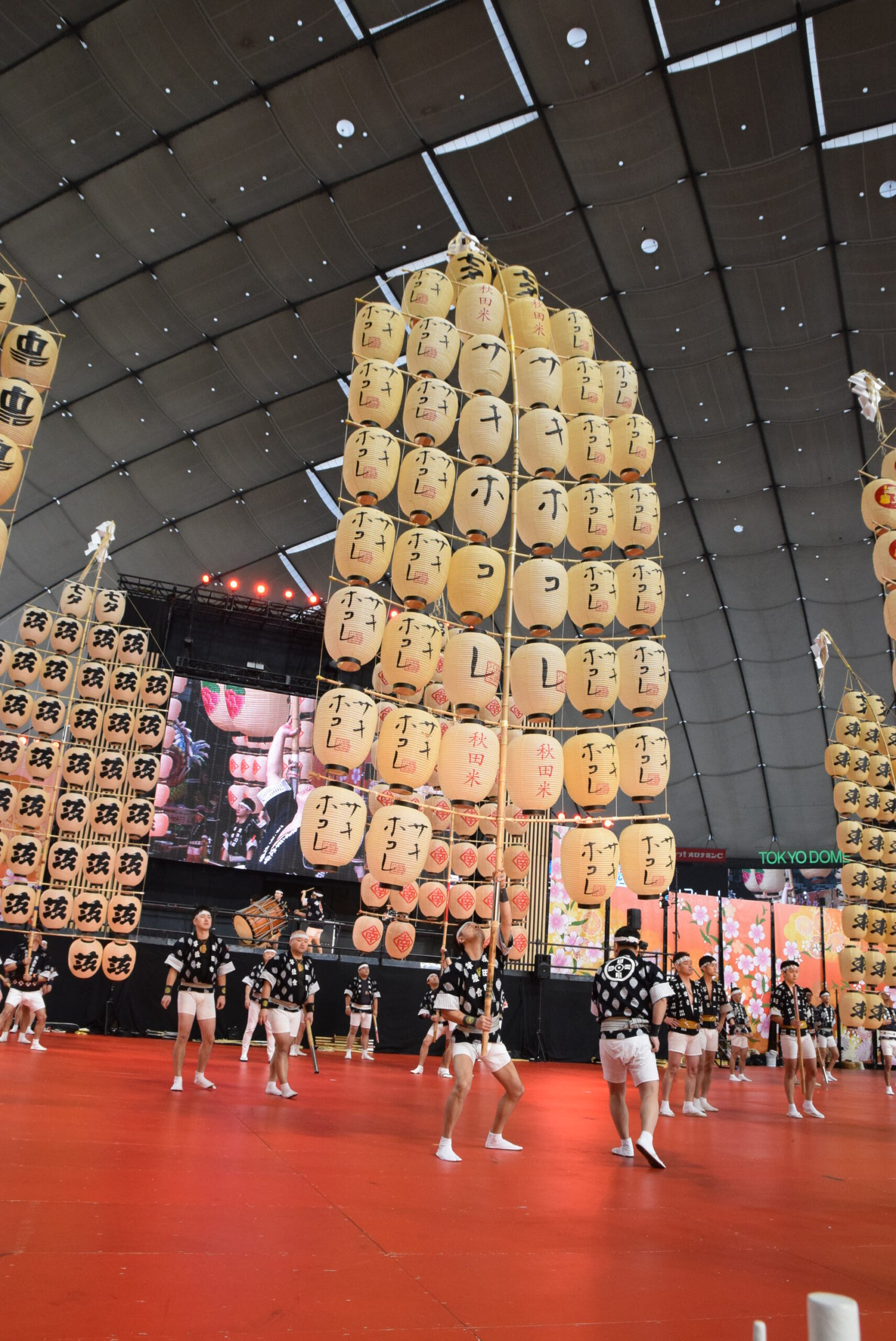 実際の秋田竿燈まつりは屋外なので、ろうそくを使い本物の火を灯すそうですが、今回は東京ドームの屋内のためLEDを使っています。それでも、昼間とは全然違う竿燈の雰囲気を味わえました。