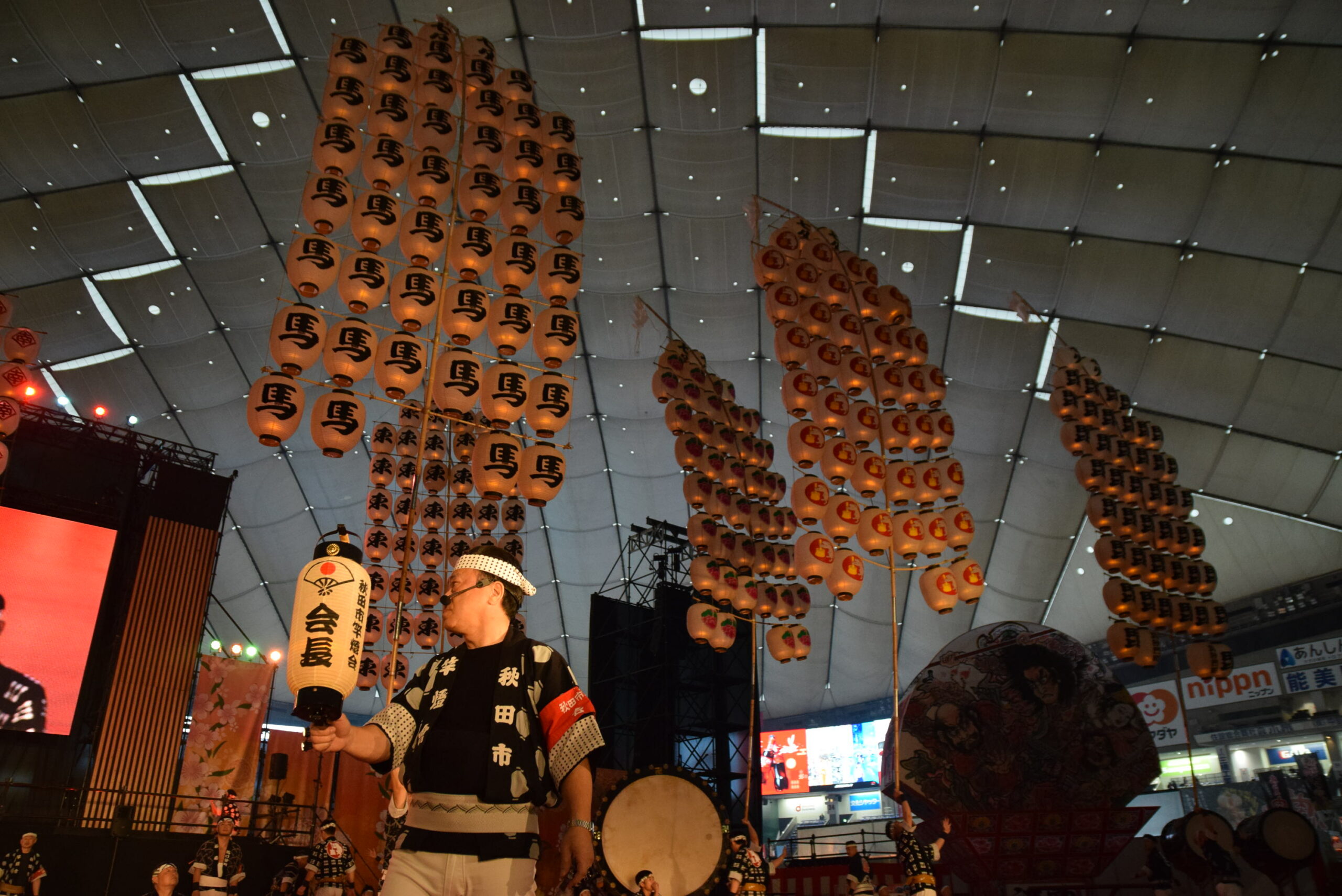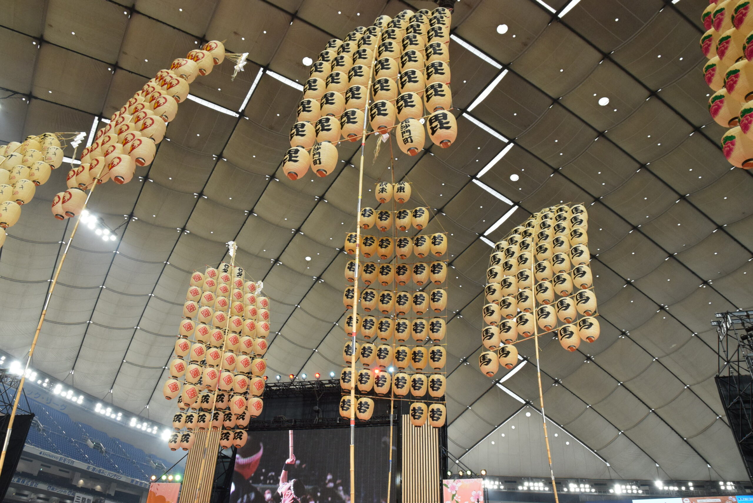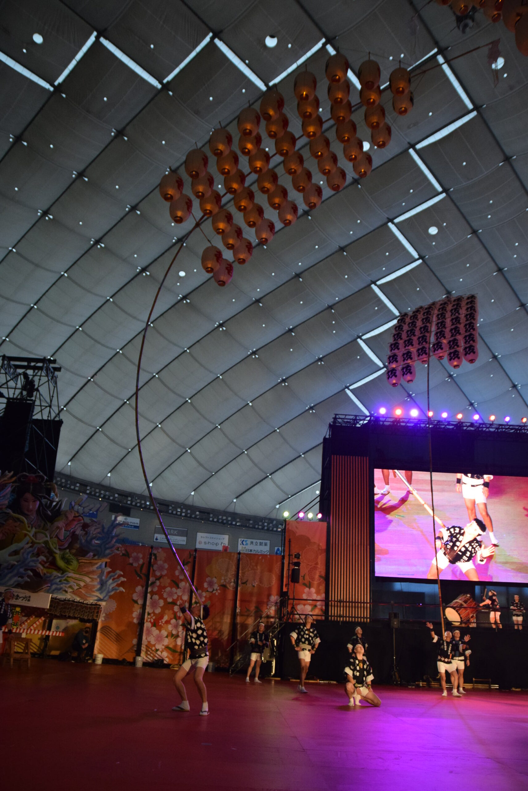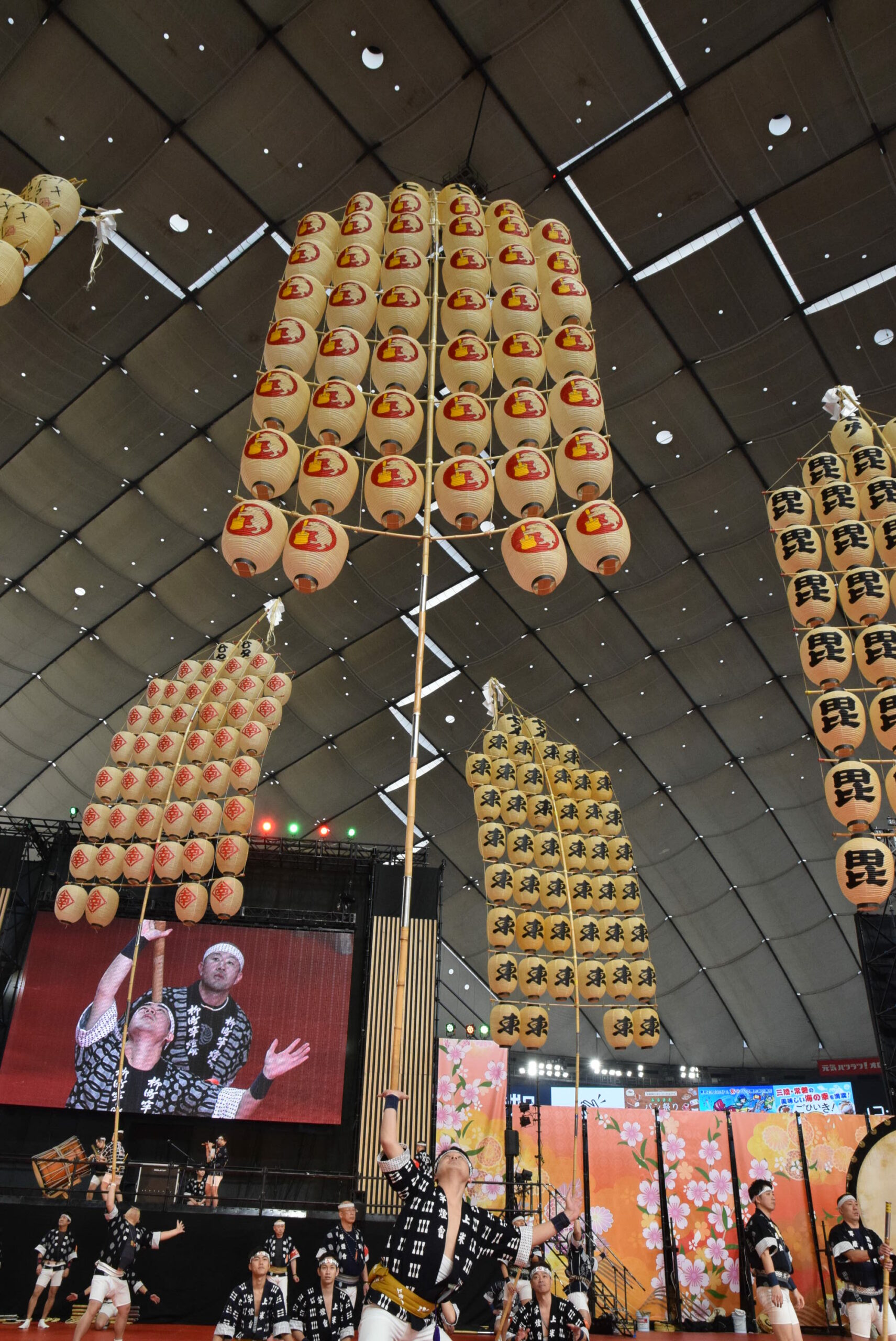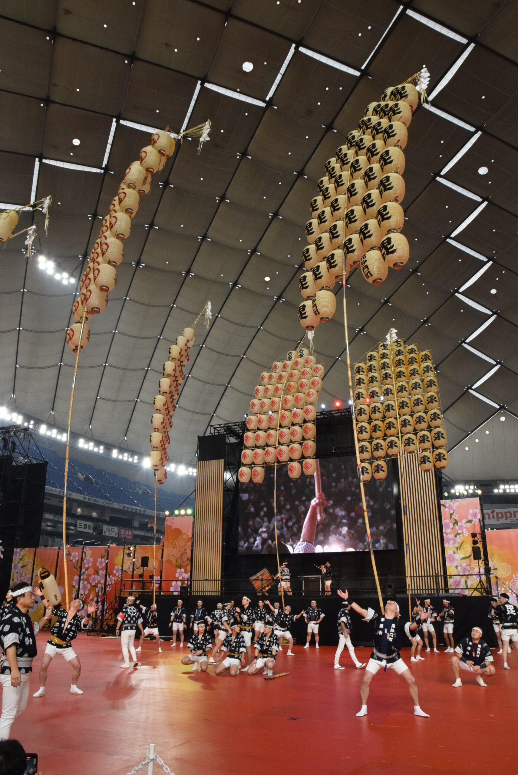 実際の秋田竿燈まつりは屋外なので、ろうそくを使い本物の火を灯すそうですが、今回は東京ドームの屋内のためLEDを使っています。それでも、昼間とは全然違う竿燈の雰囲気を味わえました。