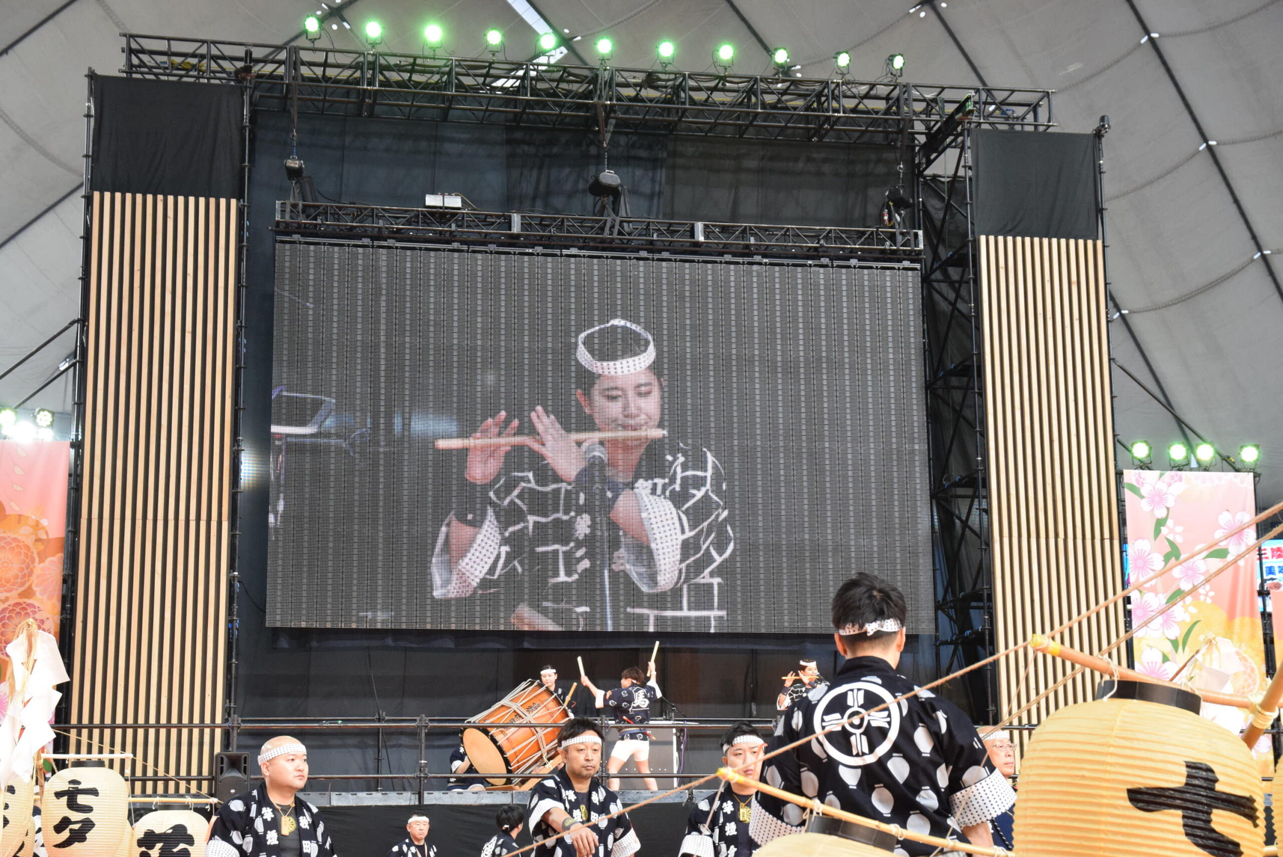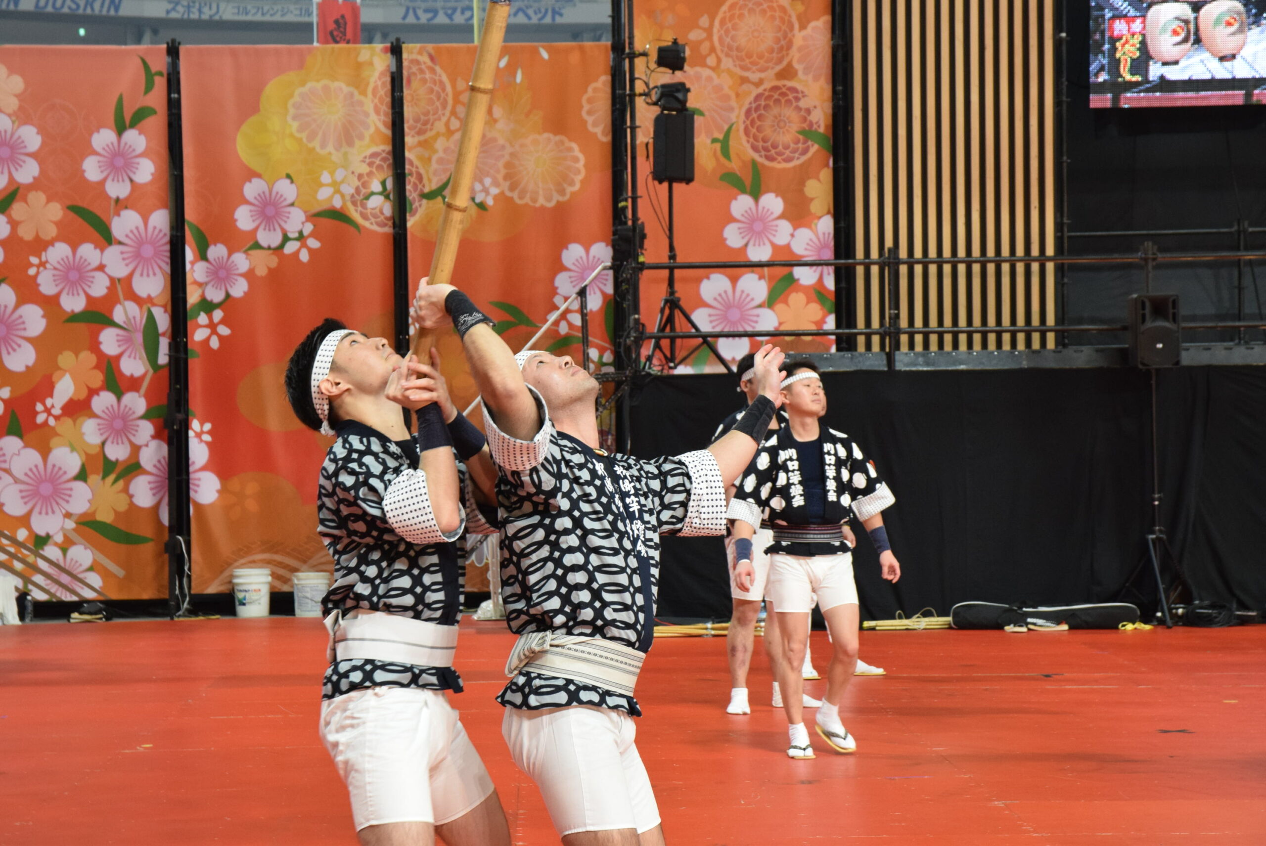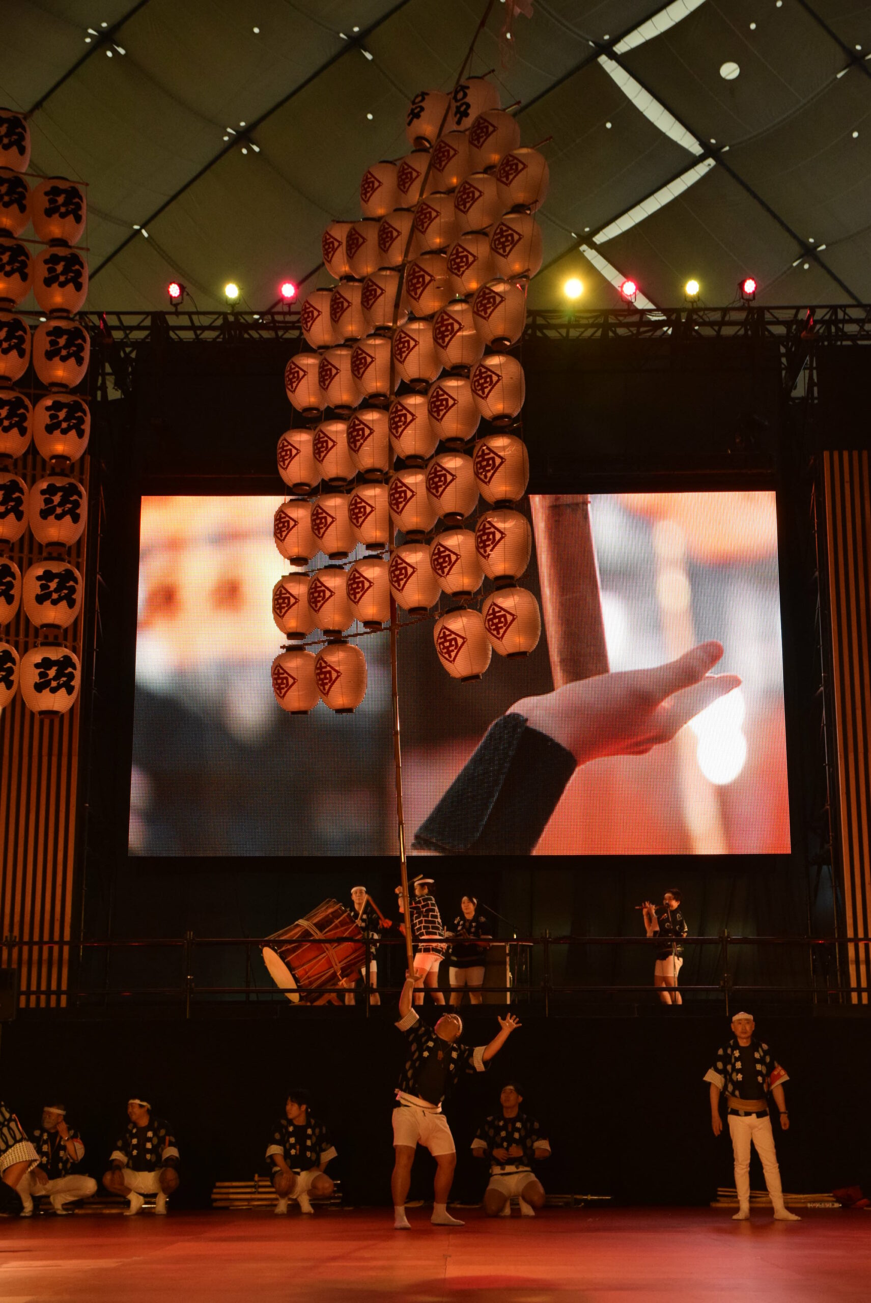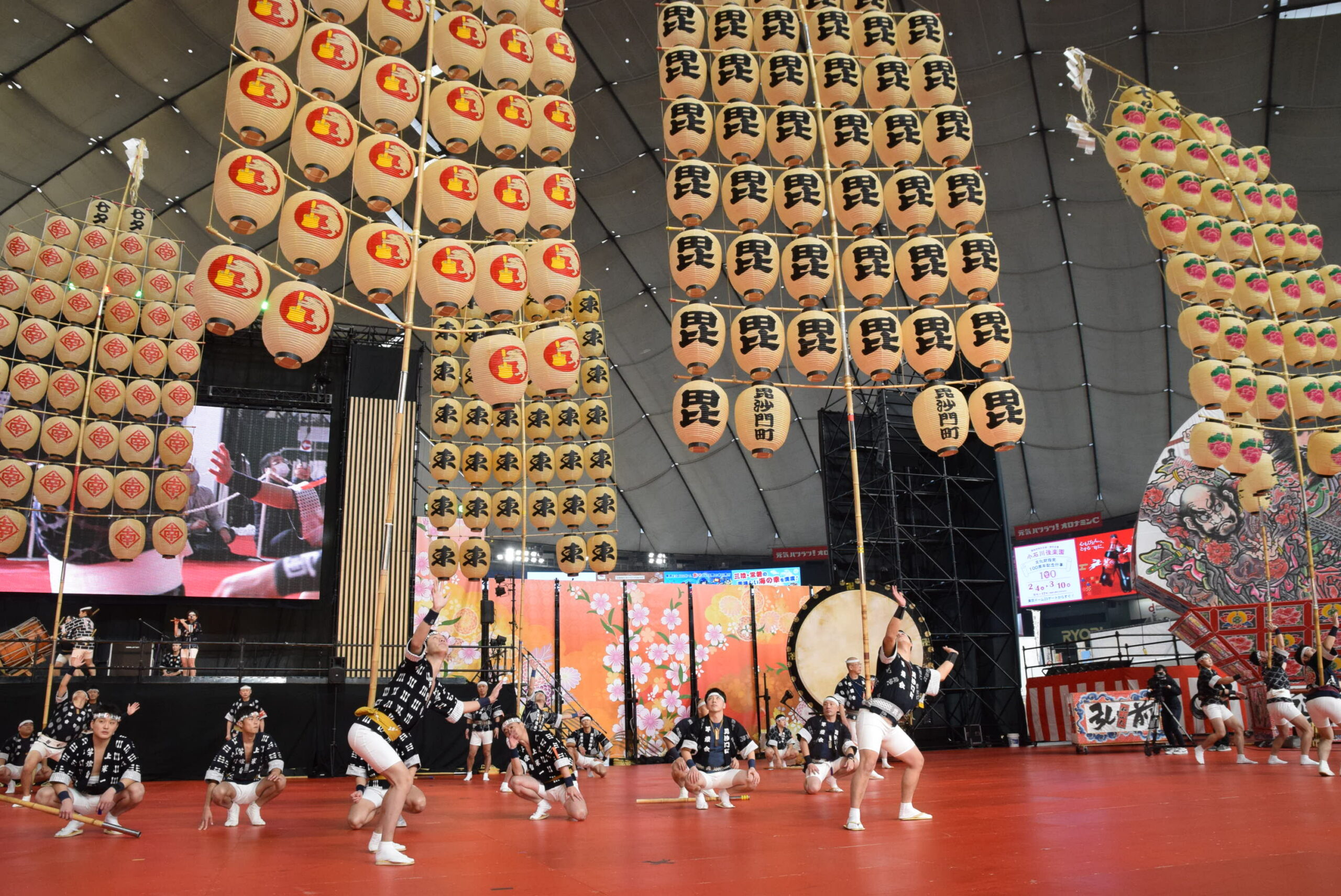 実際の秋田竿燈まつりは屋外なので、ろうそくを使い本物の火を灯すそうですが、今回は東京ドームの屋内のためLEDを使っています。それでも、昼間とは全然違う竿燈の雰囲気を味わえました。