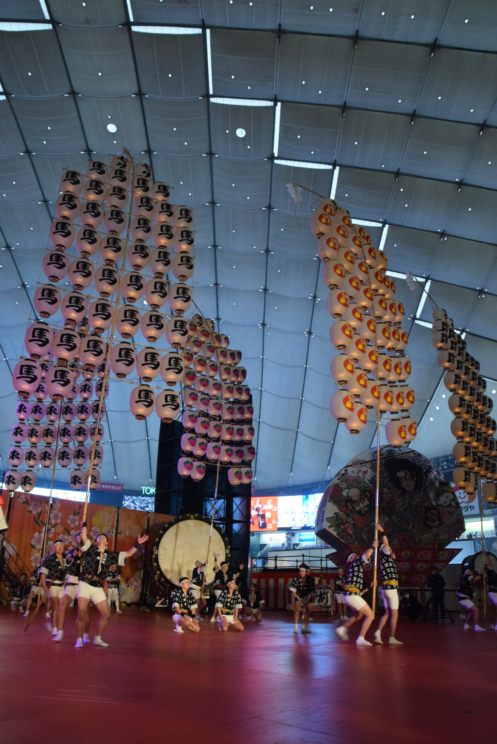 実際の秋田竿燈まつりは屋外なので、ろうそくを使い本物の火を灯すそうですが、今回は東京ドームの屋内のためLEDを使っています。それでも、昼間とは全然違う竿燈の雰囲気を味わえました。