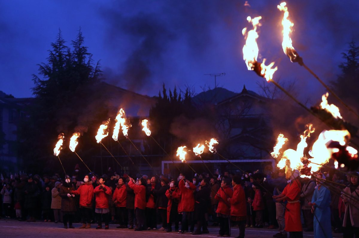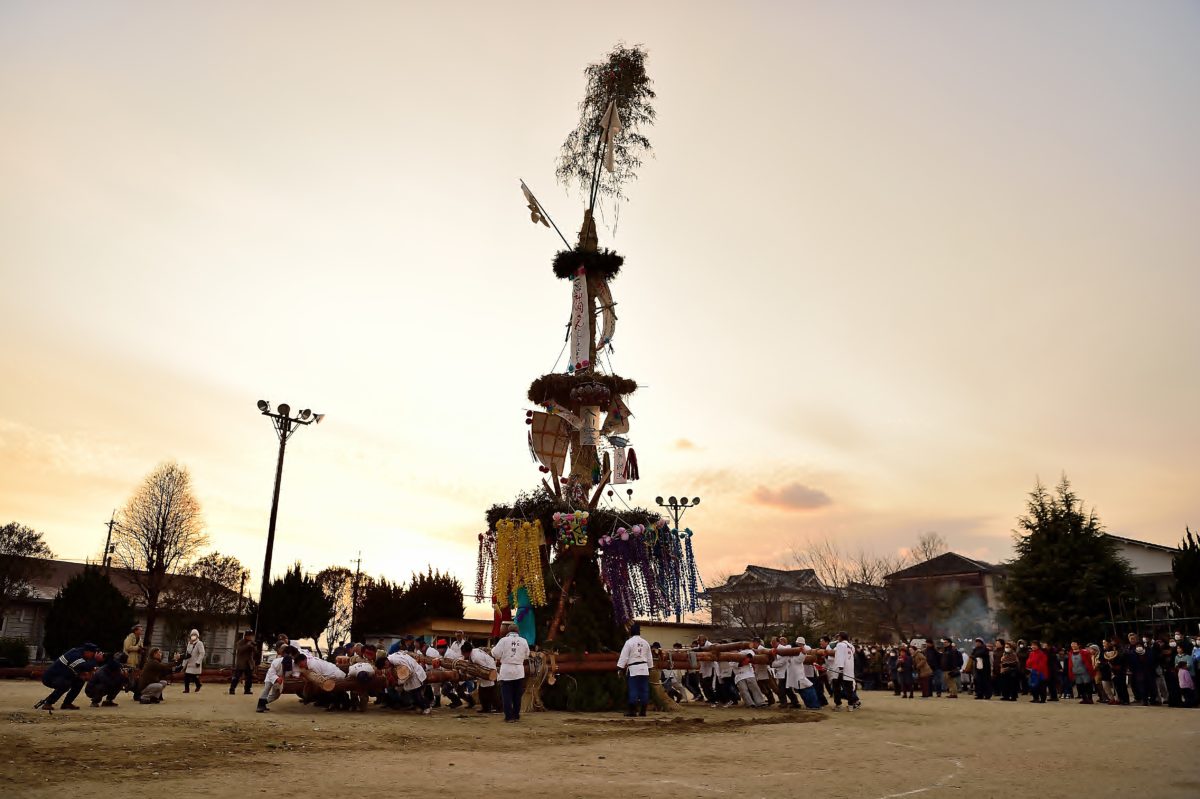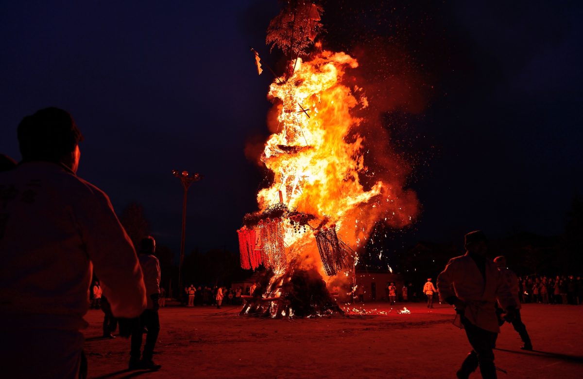 地域の皆で応援して、最終地まで持ってきました!!お疲れ様でした。陽も落ちてきました。松明に火がついて皆でその時を待ちます。