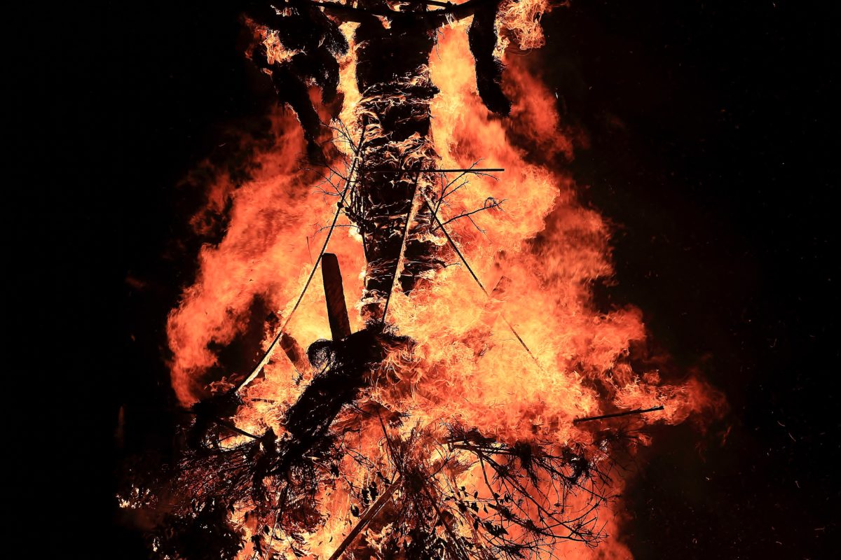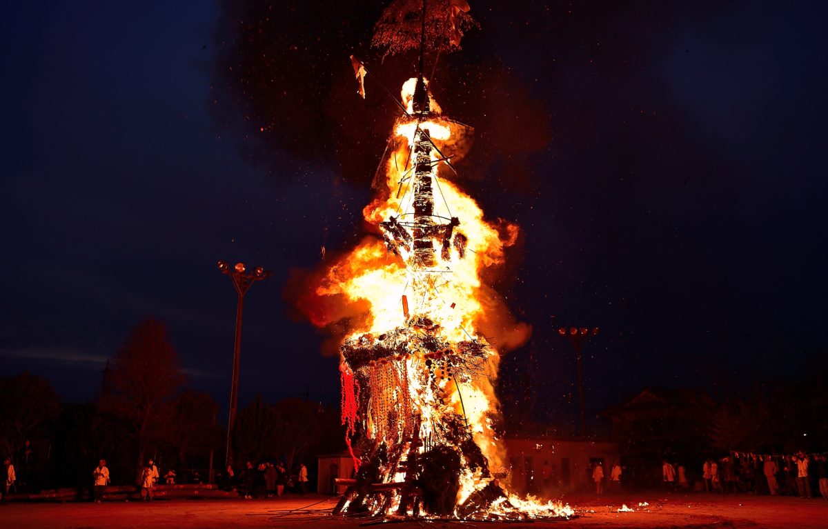 中心が燃えていく、造るのに相当の時間と労力がかかってる明神さんが燃えていく!