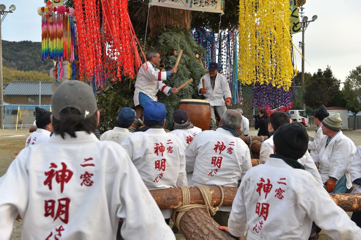 二窓の神明祭は、400年以上の歴史ある火祭りです。二窓地域の成人行事として、竹や木で組まれた「神明さん」を運んで、夕暮れを待って火をつけます。祭りの起源は、戦国武将・小早川隆景が戦勝祈願のため、やぐらを作って神明を祀ったことがはじめといわれてます。高さは20メートル重さ3.5トンちかくあり、竹原市内では90体近くありその中でも最大級です。伝統行事として、代々受け継がれ地元で長く愛されてるお祭りです。