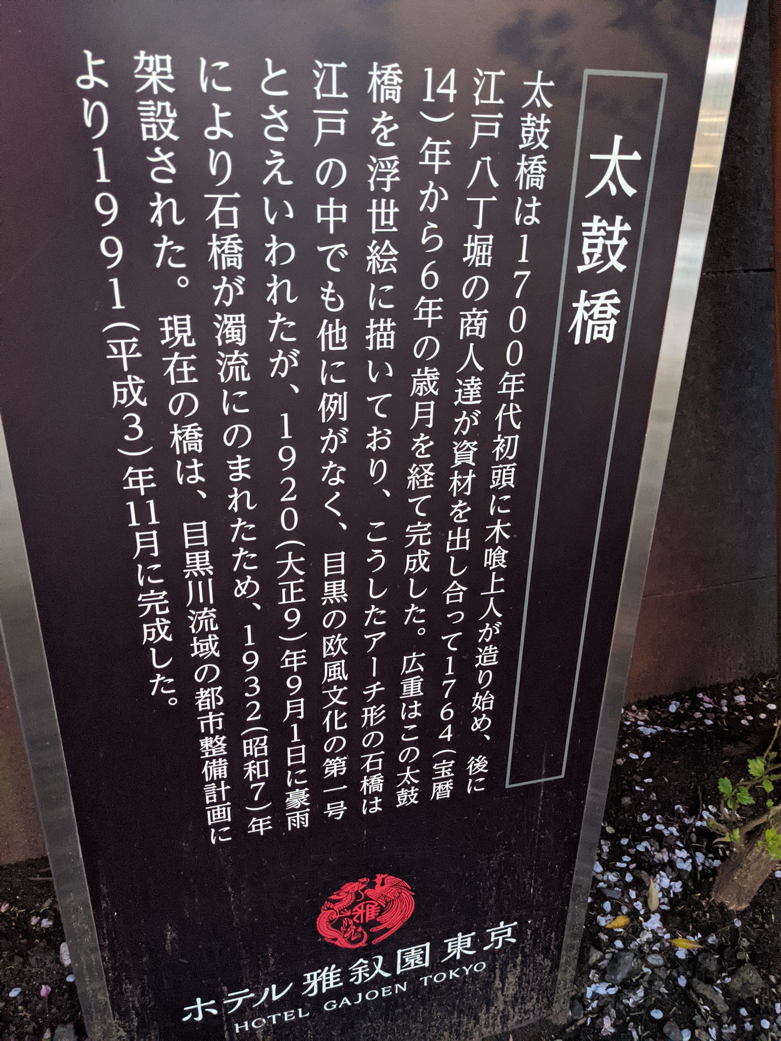 3月31日にホテル雅叙園東京(以下「ホテル」)とすぐ近くの目黒川太鼓橋付近の桜を見に行って来ました。3月15日に恵比寿ガーデンプレイスから目黒川まで散歩をした時には、殆ど桜の花を見ることが出来ませんでしたが、2週間近く経つと満開の状況で、一部のソメイヨシノは散り始めている様子でした。古今和歌集の「花の色は移りにけりないたづらにわが身世にふるながめせしまに」を思い出し、桜の花の遷り変わりは早いなとしみじみとしましたが、ホテル雅叙園東京のブランドコンセプトは『日本の美ミュージアムホテル』。90年以上の伝統を受け継ぎ、2,500点もの日本画と美術工芸品に彩られた唯一無二の空間です。中でも百段階段は、東京都の有形文化財に指定されており、ホテルに現存する唯一の木造建築です。今回は、桜を中心に、その様子をレポートいたします。