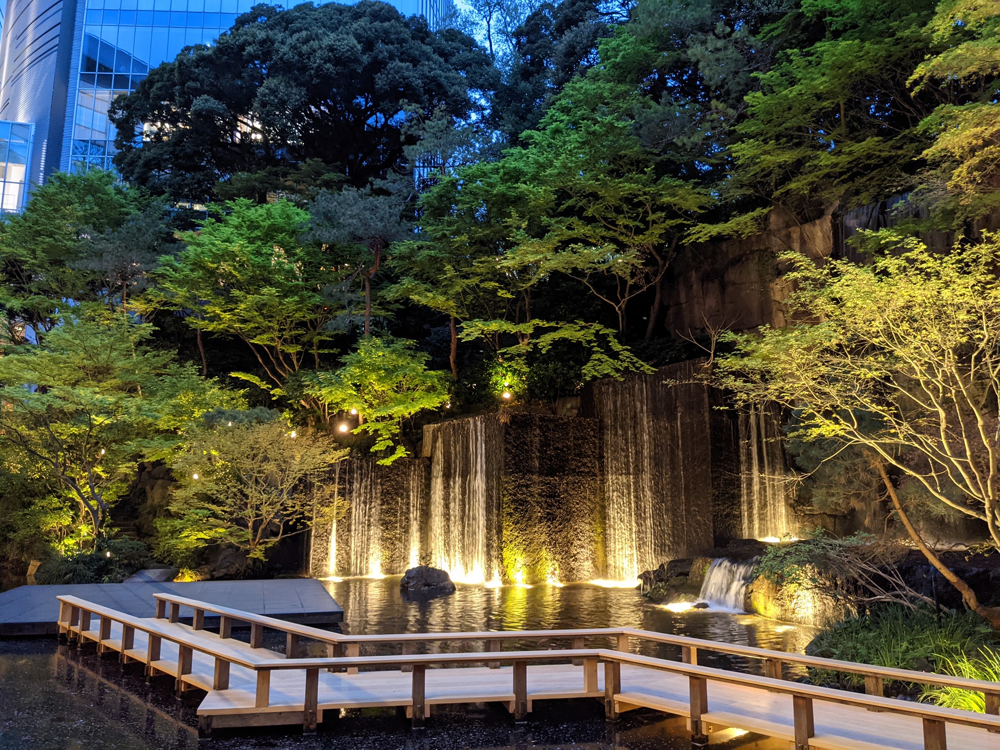 とても綺麗な日本庭園です。日が暮れてきて、木々と滝をスポットライトが黄金に照らしております。90年の伝統と経験から積み上げられた、食・婚礼・祭事、 創業者の究極的なホスピタリティの追求から育まれた絢爛豪華な美術・工芸品、更に時を経て昇華した文化財と優雅な客室。日本の美が詰まった唯一無二のミュージアムホテルとしてサービスを展開しております。