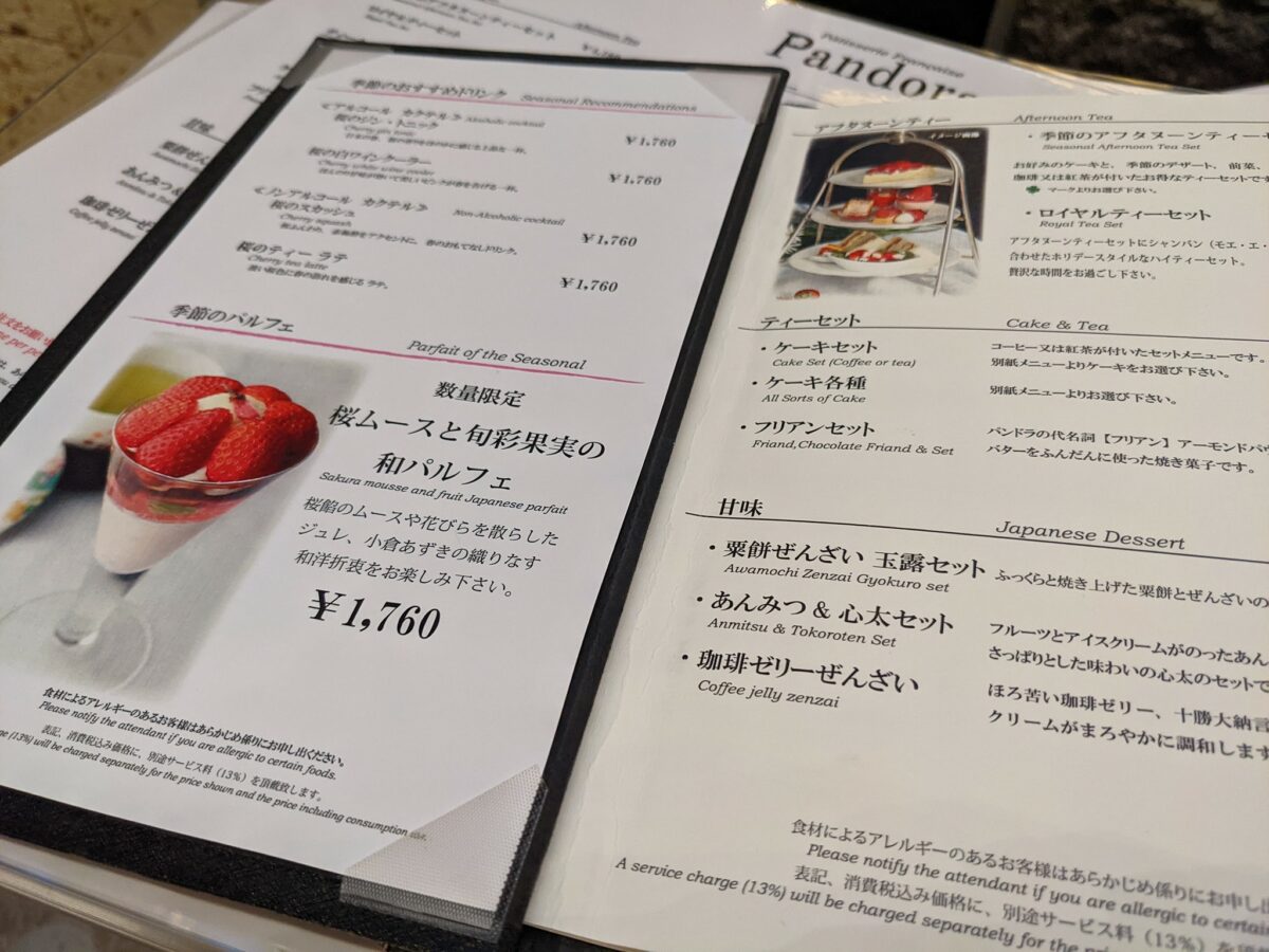 日本庭園も見えるカフェラウンジ「パンドラ」のメニューの一部。苺ムースと旬彩果実の和パルフェが、春めいており美味しそうです。季節ごとに色々なメニューが楽しめます。
