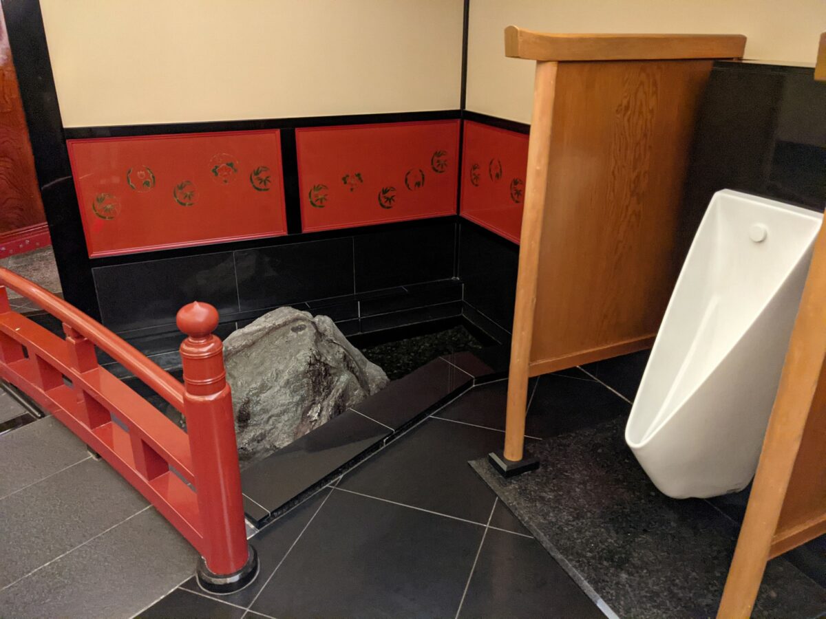 ホテル内に川が造られており、その川はトイレまで続きます。トイレの中に川があるのは、ホテル雅叙園東京が日本では唯一でしょうか。