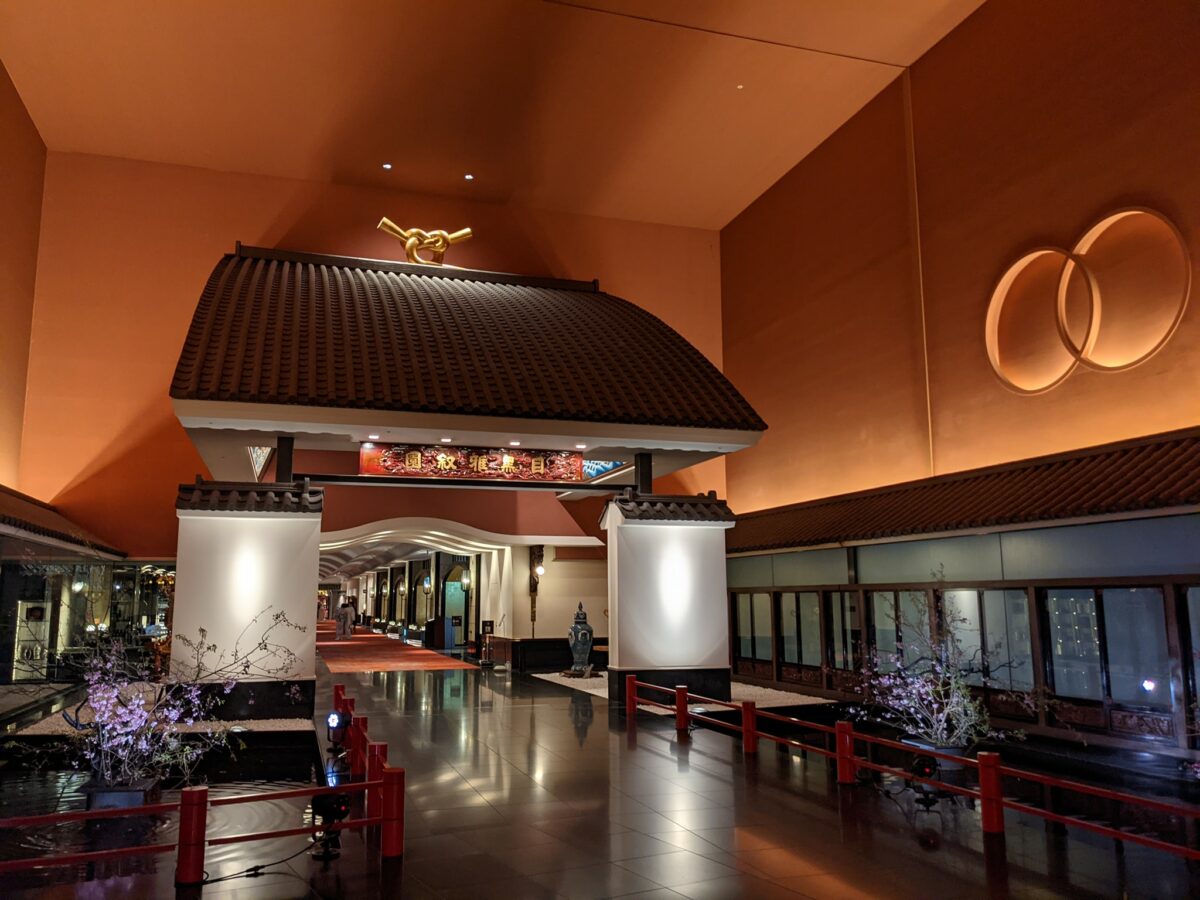 ホテルのエントランス。少し日が暮れてきましたが、桜とスポットライトで美しく彩られています。HPによると、そのルーツは、創業者・細川力蔵が、東京 芝浦にあった自宅を改築した純日本式料亭「芝浦雅叙園」だったそうです。 創業当時は北京料理や日本料理の高級料亭でしたが、より多くの人々に本格的な料理をと考え、1931年(昭和6年)庶民や家族連れのお客様が気軽に入れる料亭として目黒の地に誕生しました。料理の味だけでなく、お客様に、目でも楽しんで頂きたいと考え、壁画、天井画、彫刻などで館内の装飾を施したことから、東洋一の美術の殿堂と言われる豪華絢爛なホテルとなり、2017年4月1日には「目黒雅叙園」から「ホテル雅叙園東京」へと施設名称が変更されました。