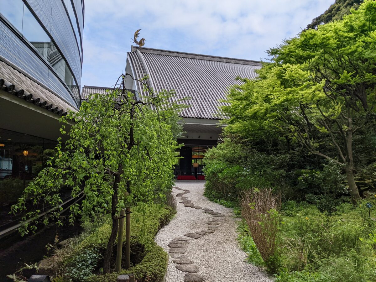 ホテルメインエントランスの後方からの景色となります。鳳凰と瓦屋根が日本庭園と調和しております。