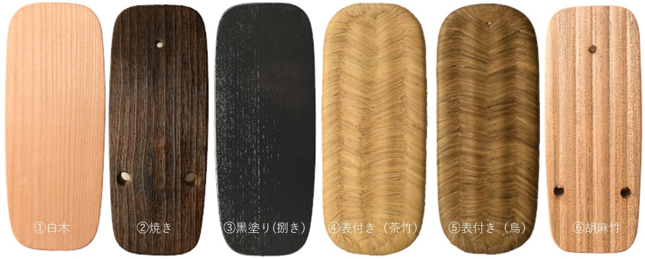 ①白木 ②焼き ③黒塗り(捌き)④表付き(茶竹)⑤表付き(烏)⑥胡麻竹