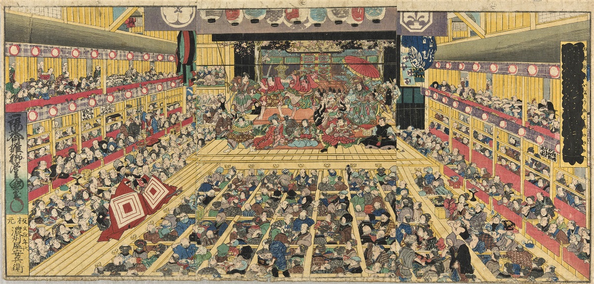 江戸時代から芝居小屋には「かべす」が付き物。菓子や料理を食べながら歌舞伎を観る観客が描かれている/三代目歌川豊国「踊形容江戸絵栄」
