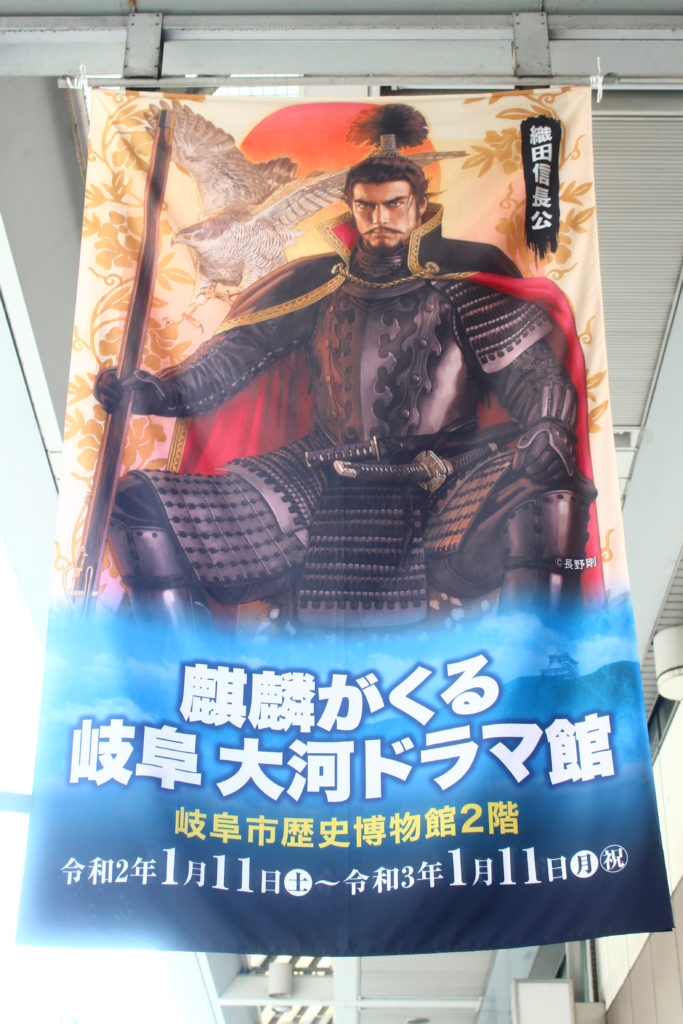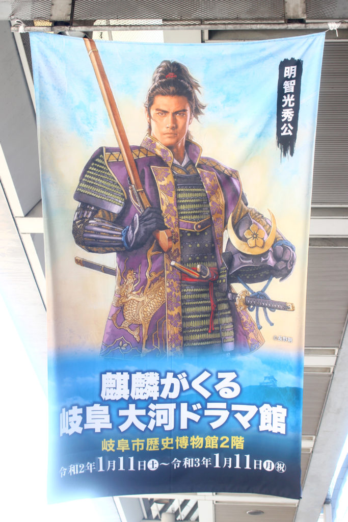 行列がやってくる長良橋通り(国道157号)へやってきました。沿道の商店街には岐阜にゆかりのある各武将のたタペストリーが飾られています。こちらは来年の大河ドラマ「麒麟がくる」の主役、明智光秀公です!