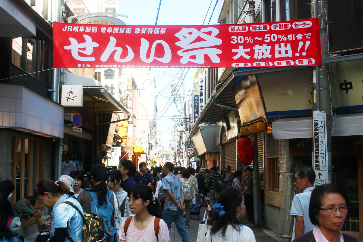さらに進み、柳ヶ瀬のアーケード付商店街までやってきました。のぼりがお祭りの雰囲気をあげてくれます!