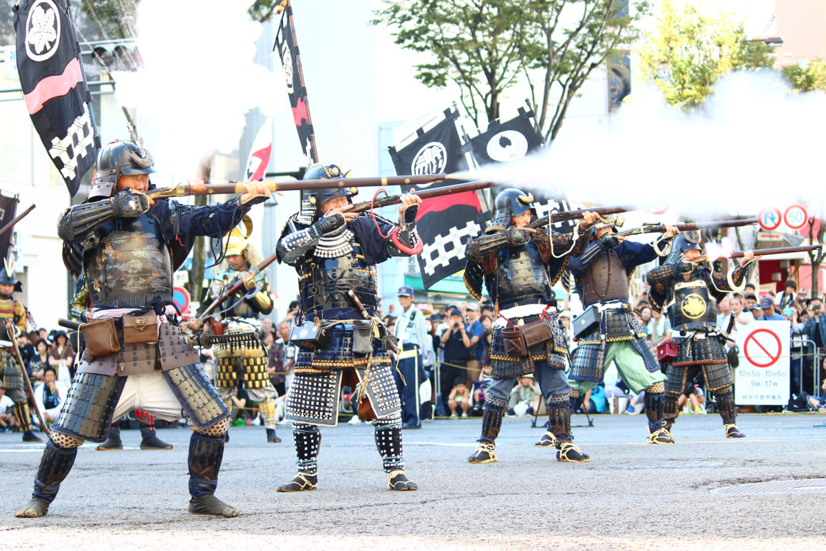 行列が進んだところで、鉄砲隊による火縄銃の披露がはじまりました!色とりどりの甲冑を着た武士が並びカッコいいですね!