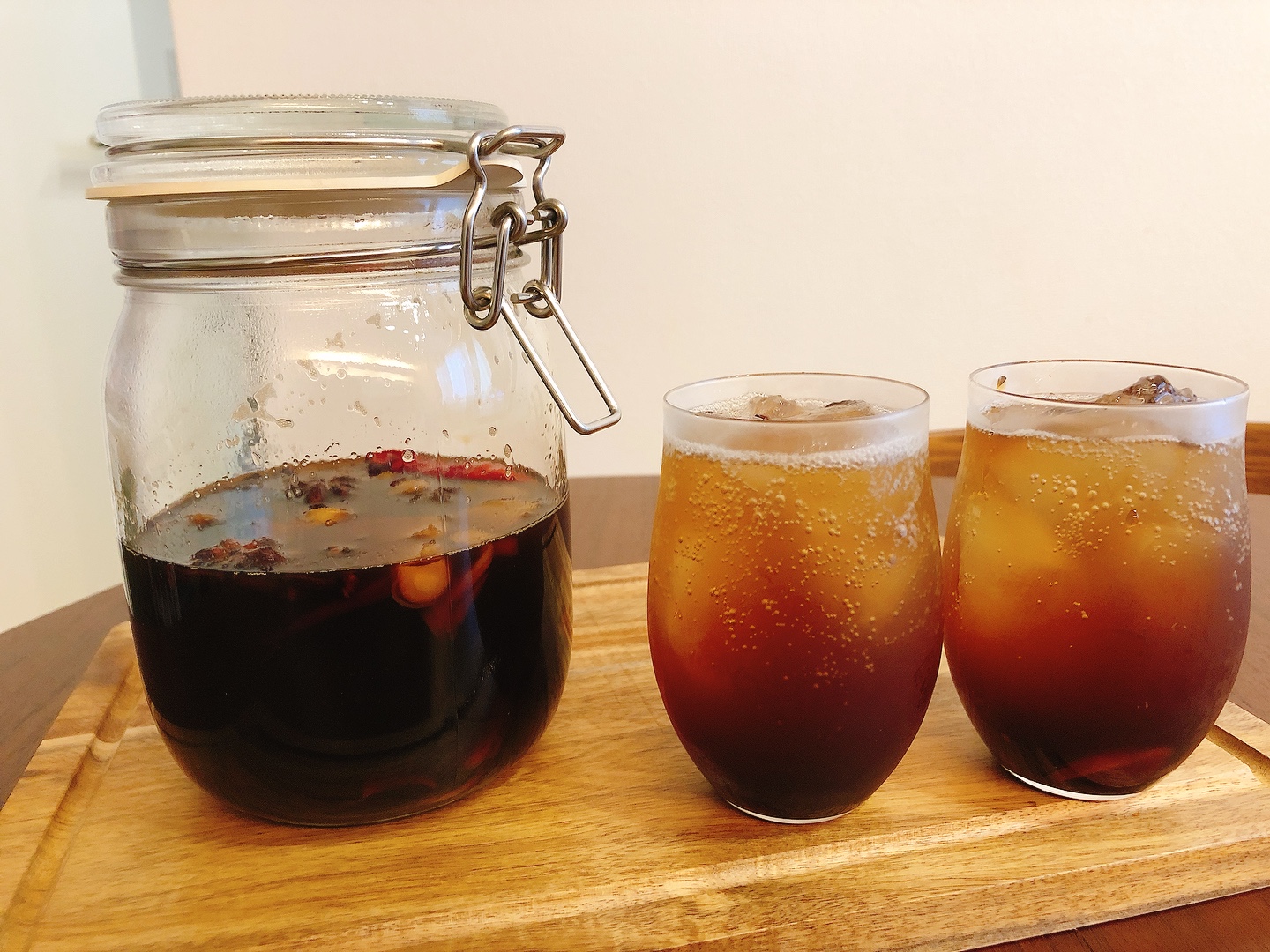 20分後に火を止めて、煮沸した保存容器に移せば完成!氷を入れたグラスに、シロップ1:炭酸水3くらいの割合で注げば自分だけのクラフトジンジャーエールをたっぷり楽しむことができます◎ 黒糖のマイルドな甘みと生姜の香りが身体に染みわたる~! 市販のものよりスパイスの複雑さが口に広がり、喉にピリっと残る刺激がたまらない!こんなに簡単においしいジンジャーエールが作れてしまうのですね。