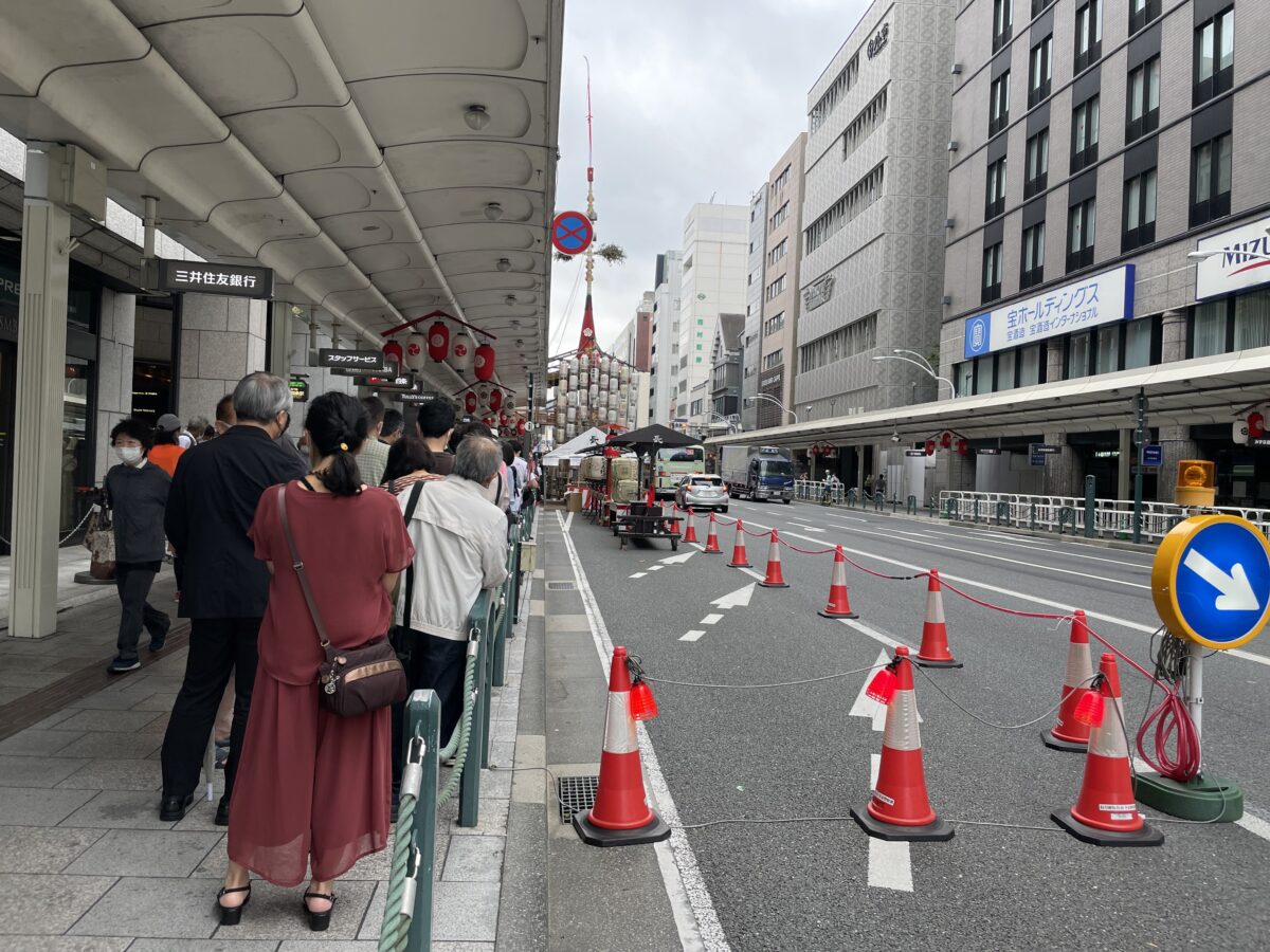 筆者は四条烏丸と河原町の中間地点、「くじ改め」と「注連縄切り」が行われる中間地点に陣取りました。