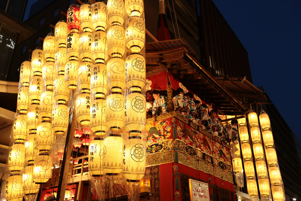 写真:前祭 宵山での「長刀鉾」のお囃子 宵山のときだけに見られる提灯の灯りが美しい