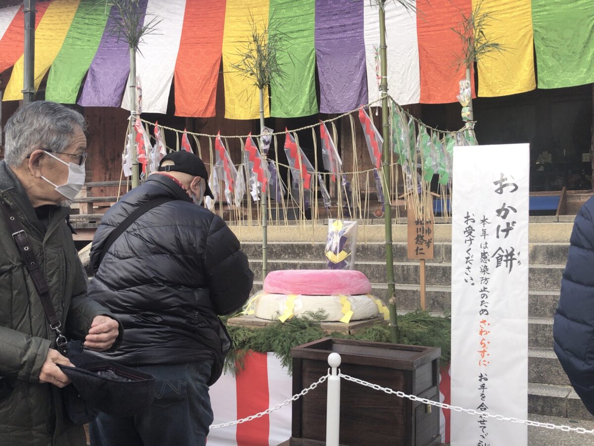 本堂の金堂前には「おかげ餅」という大鏡餅が奉納されています。このお餅に手をふれると、1年間無病息災でいられるという言い伝えもある鏡餅です。