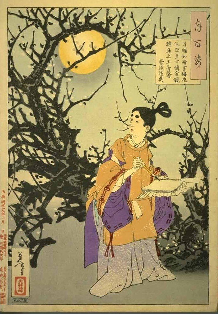 菅原道真は西暦845年6月25日、学者の家に生まれます。母方の家系は、万葉詩人である大伴旅人(おおとものたびと)や大伴家持(おおとものやかもち)を輩出しており、道真も幼少期から優れた詩歌の才を垣間見せていました。